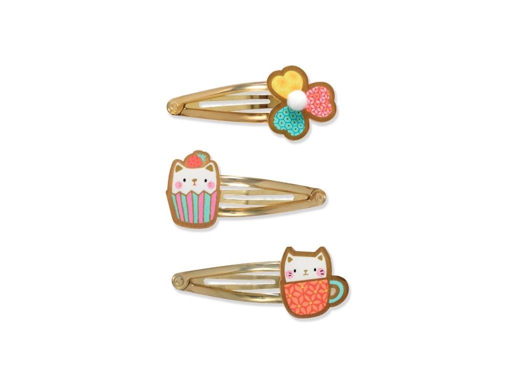 Sada troch sponiek Yoko sú kovové sponky do vlasov s epoxidovou úpravou pre hladké nasadenie a pohodlné vyberanie. Ozdobné prvky dodajú účesu jemný detail na bežný deň aj detskú oslavu.