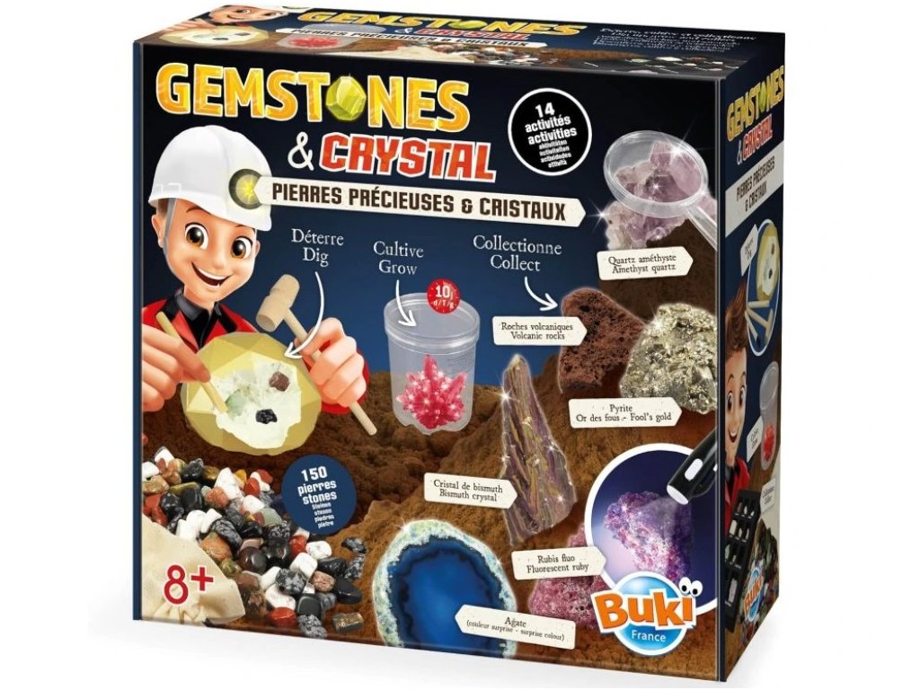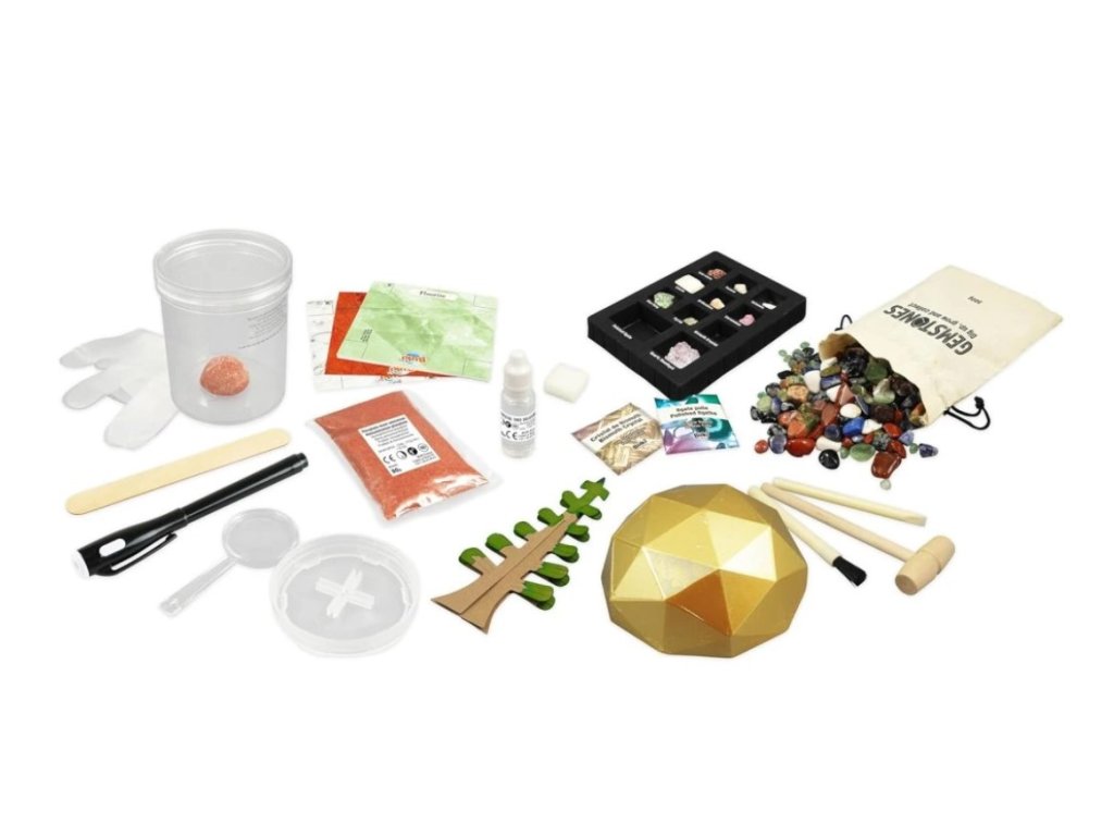 - Hravé vykopávanie — v balení je blok sadry so skrytými surovými kameňmi, ktoré si dieťa vyťaží pomocou priložených nástrojov.