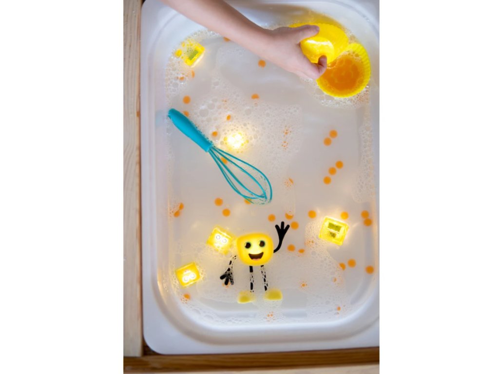 - Hra na suchu: Aj po vybití batérií môžu kocky slúžiť na triedenie farieb, stavanie veží alebo ako náklad pre hračkárske autíčka
