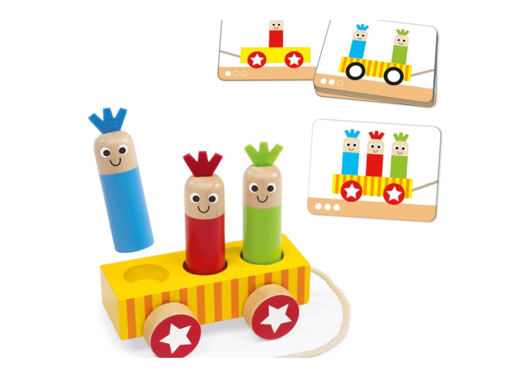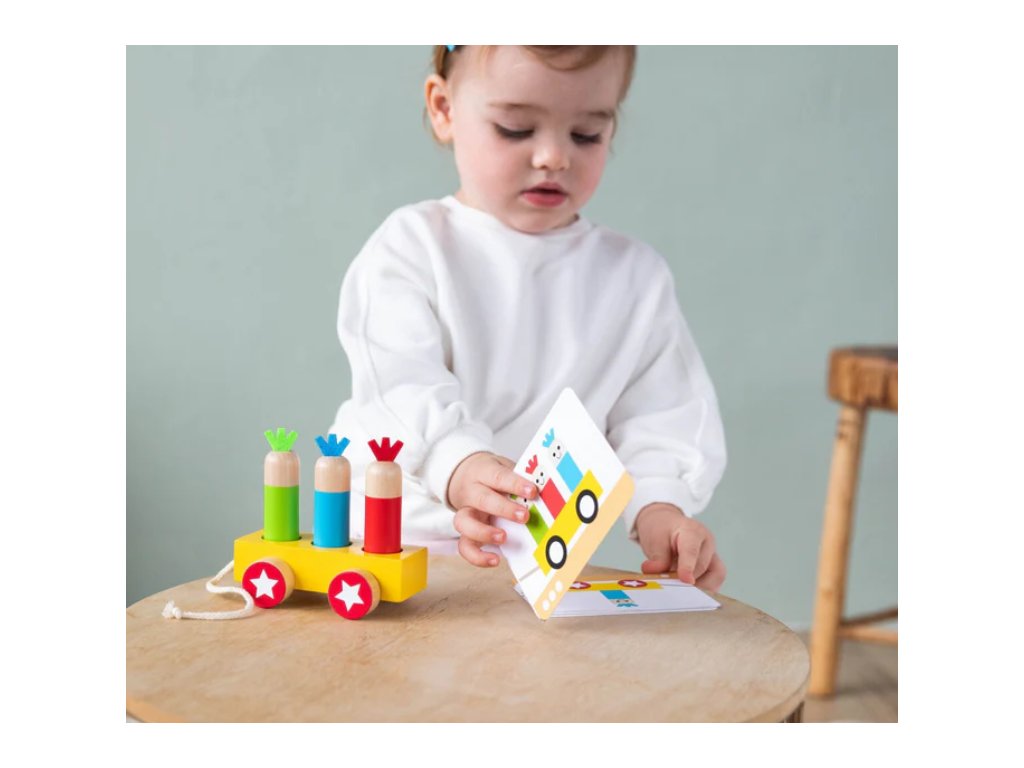 Logická hra, v ktorej zostavíte vlak podľa kariet. Táto výzva pomáha deťom rozvíjať ich vizuálne vnímanie. Vyberte si kartu, pozrite sa na obrázok a potom zostavte vlak. Najprv postavte vagón s kolesami a nakoniec umiestnite figúrky podľa pokynov na karte. Karty sú postupne jednoduchšie, aby si ich mohli zahrať všetky deti.