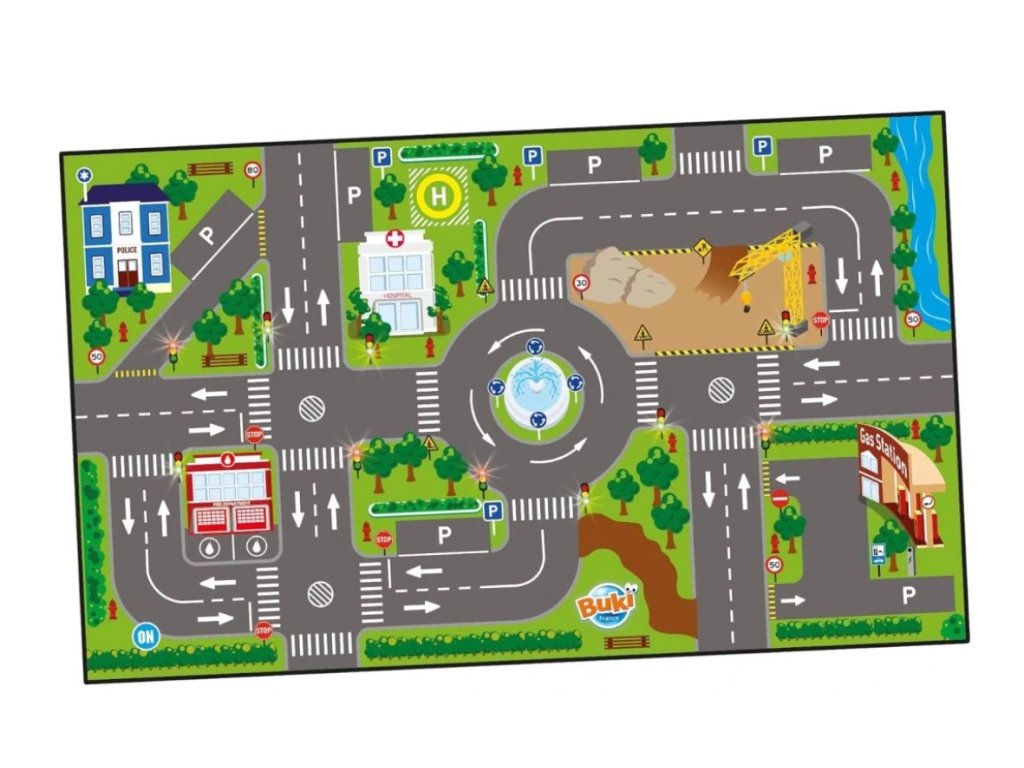 Doprajte deťom zábavnú a poučnú hru s hracím kobercom so svetelnými semaformi, ktoré menia farbu! Tento mäkký koberec z polyesteru ponúka realistickú mestskú scenériu, kde sa deti môžu pohybovať so svojimi malými autíčkami a učiť sa dopravné pravidlá. Koberec obsahuje základné mestské prvky ako je policajná stanica, nemocnica s heliportom, hasičská stanica, parkoviská, benzínová pumpa, stavba, kruhový objazd a ďalšie.