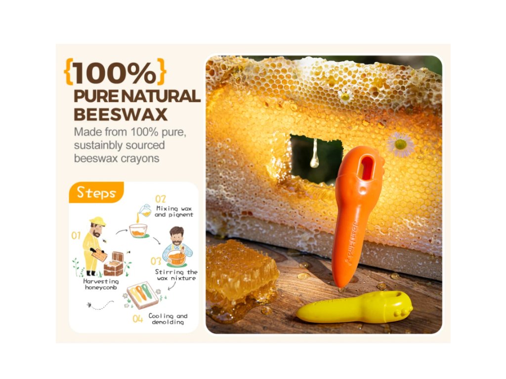 Jarmelo voskovky z včelieho vosku sú stvorené pre malých umelcov s veľkou fantáziou. Bezpečné, nelámavé a voňavé – kreslia jemne a ľahko sa držia aj v detských ručičkách. Hravý tvar, pestré farby a 100 % prírodné zloženie robia z tvorenia čistú radosť.
