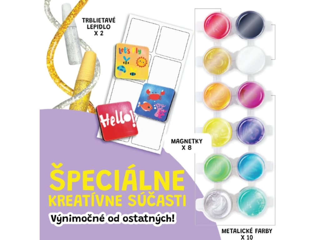 - 12 akrylových farieb (10 metalických a 2 základné odtiene) + 2 tuby trblietavého lepidla pre extra efekt