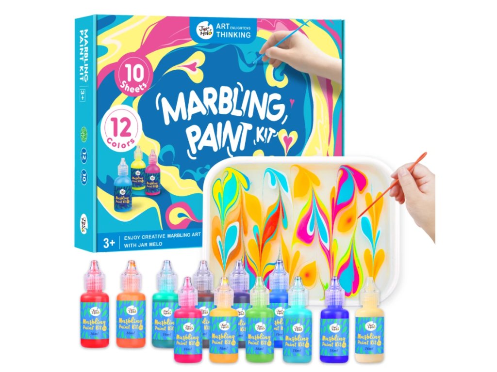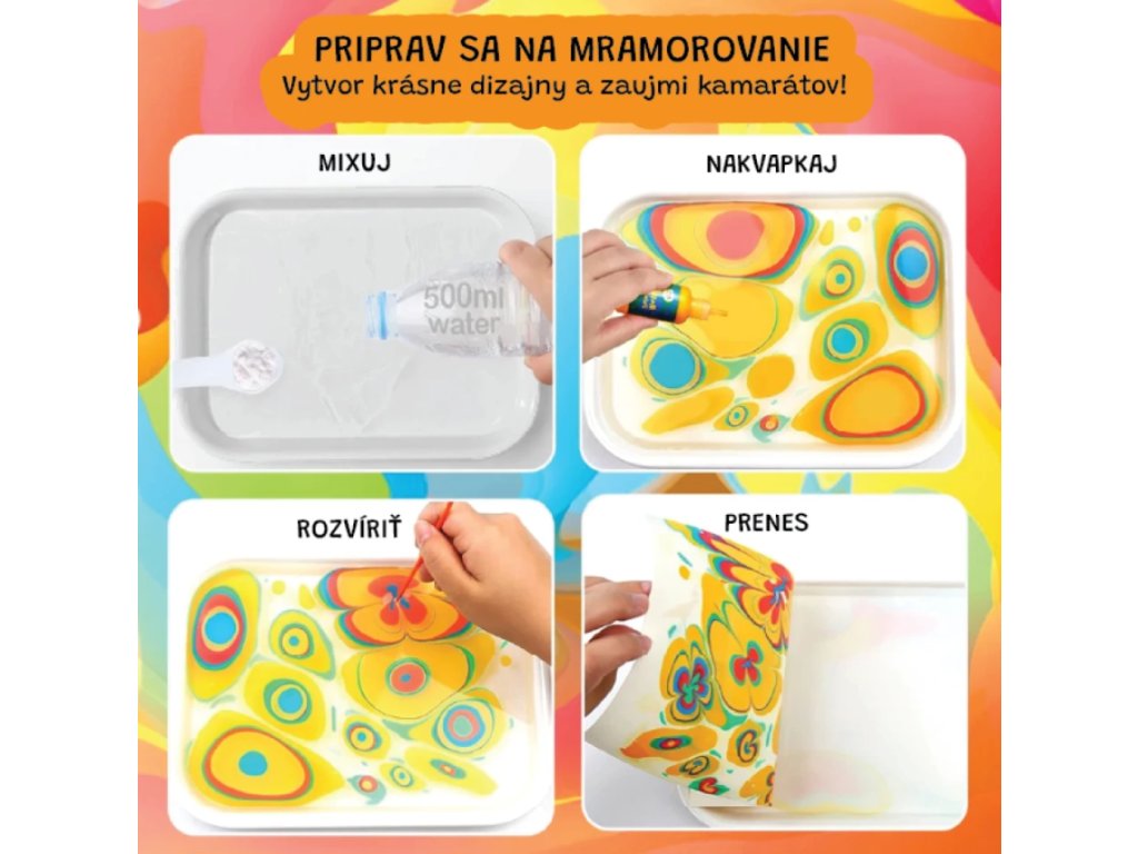 Tento magický mramorovací set od Jarmelo prináša nekonečné vzory pomocou kúzla vody a farieb. Stačí vytlačiť farbu, navzorkovať a preniesť na papier – radosť pre malé ruky i odvážnu kreativitu. Netoxické farby, minimálny neporiadok a výsledky, ktoré budú tešiť deti i rodičov.