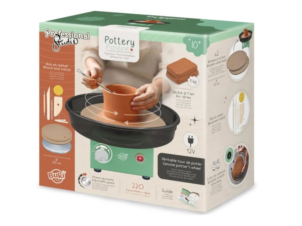 Objavte čaro keramiky so skutočným hrnčiarskym kruhom od BUKI! Tento kvalitný set umožní deťom aj dospelým spoznať základné hrnčiarske techniky a vytvoriť vlastné originálne výrobky.