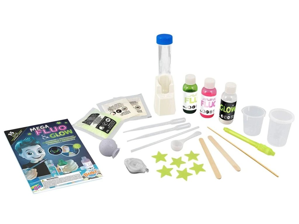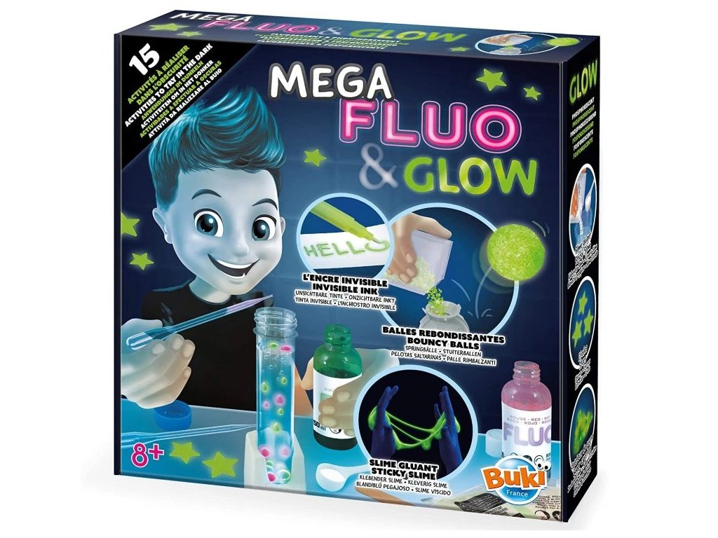 MEGA Fluo&Glow je chemické laboratórium určené pre experimentovanie a výrobu Fluo (žiarivých) a Glow (svetielkujúcich) hmôt. Sada obsahuje 20 pokusov, pri ktorých môžete napríklad vyrobiť fluorescenčný sliz, ktorý reaguje na UV svetlo, fluorescenčné umelecké diela, skákajúce loptičky, neviditeľný atrament, svetielkujúce hviezdy, lávovú lampu, mimozemské vajcia a mnoho ďalších.