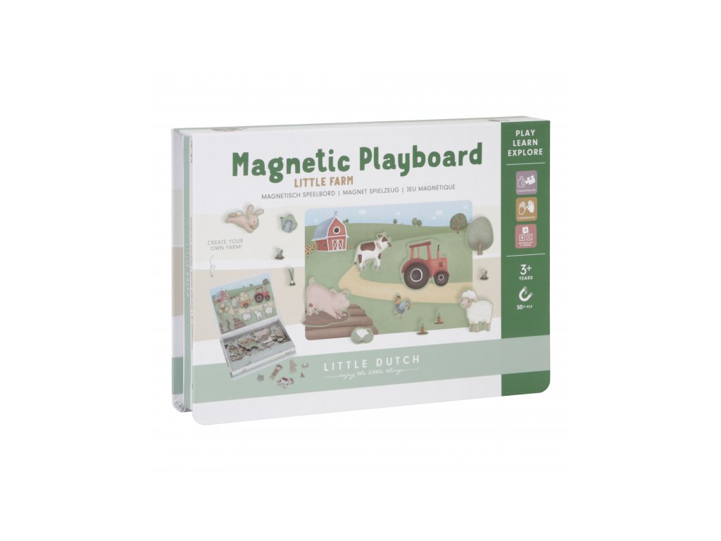 Magnetická hra sa skladá z magnetických dielov s motívmi zo života na farme a 6 vzorových kariet. Magnetické veko je možné použiť ako hernú dosku.