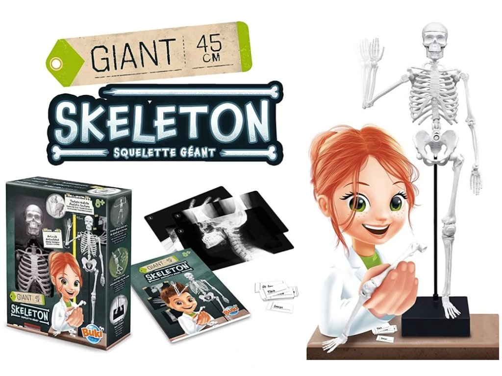 Detská experimentálna súprava obsahuje približne 45 cm vysoký model ľudskej kostry s príslušenstvom (podstavec, štítky na označenie jednotlivých kostí, röntgenové snímky).