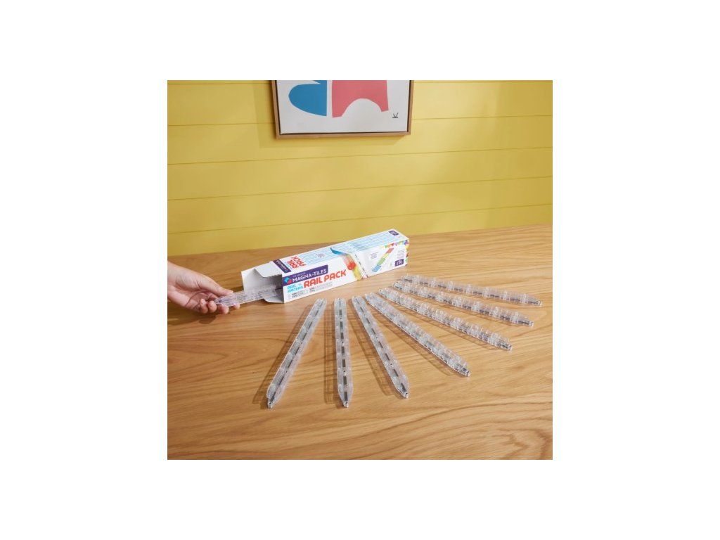 Sada MAGNA-TILES® Rail Racers – Rail Pack 8 dielov prináša novú dávku zábavy do každého pretekárskeho dobrodružstva. Pridaj osem priehľadných koľajníc s patentovaným dizajnom a vytvor dlhšie trate, vyššie rampy a prekážky, ktoré gulička prekoná raz-dva. Stačí zacvaknúť koľajnice a sledovať, ako sa zábava rozbieha!