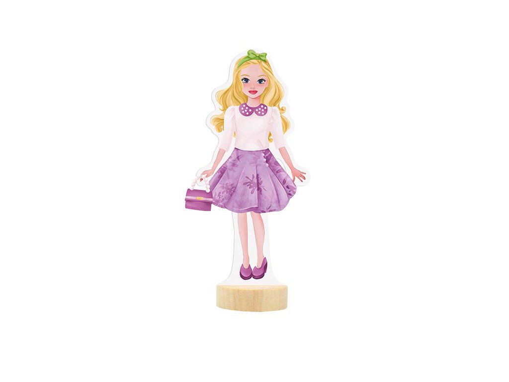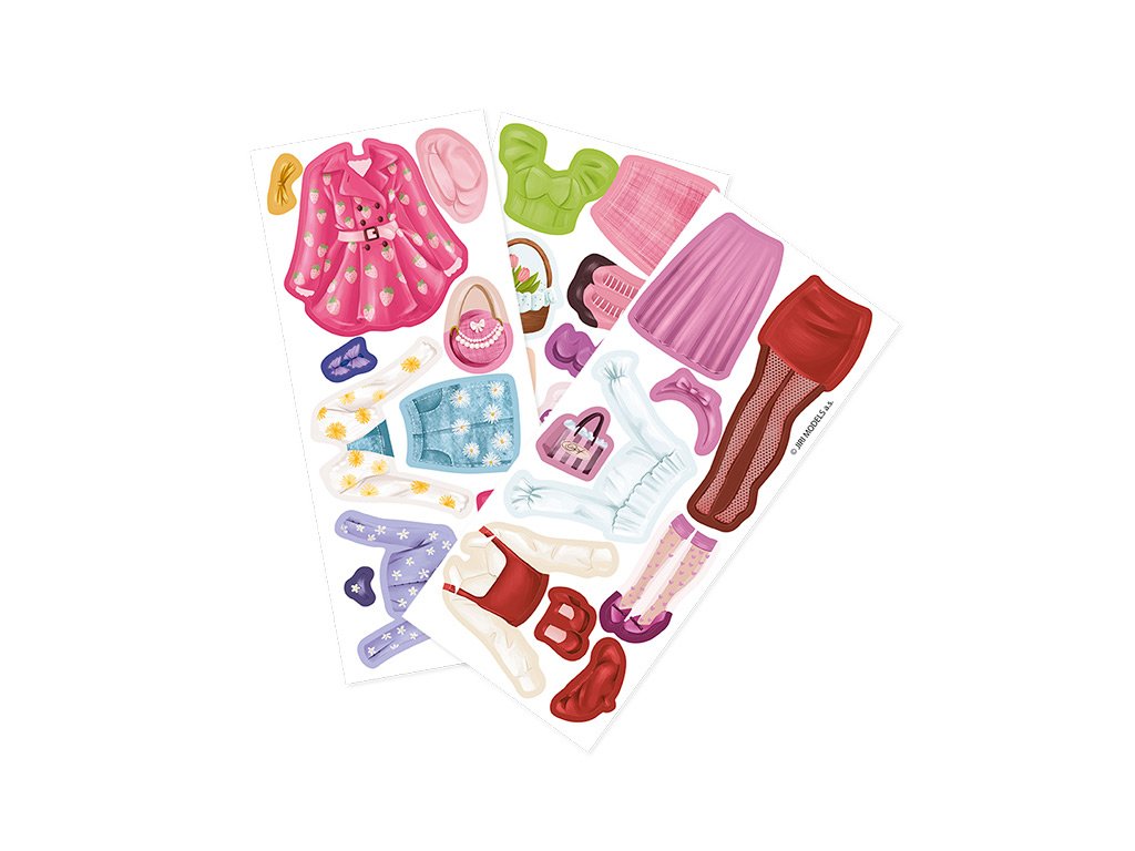 Balenie obsahuje obliekaciu postavičku, 3 hárky magnetických častí oblečenia, topánok a doplnkov a drevený podstavec.