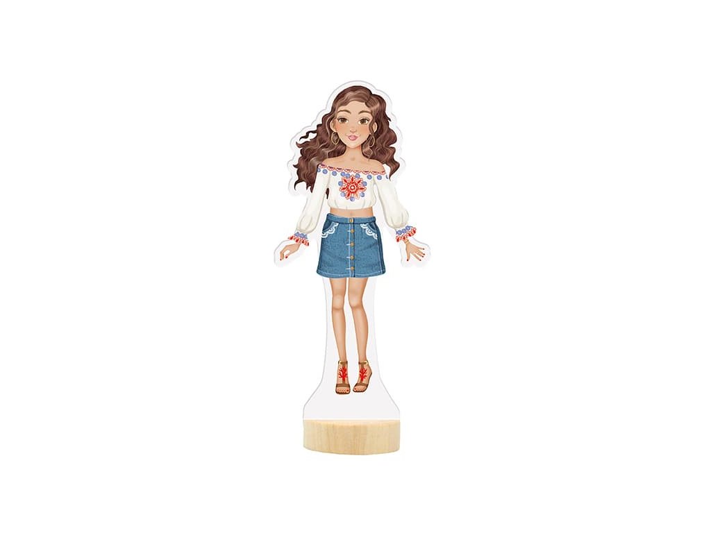 Balenie obsahuje obliekaciu postavičku, 3 hárky magnetických častí oblečenia, topánok a doplnkov a drevený podstavec.