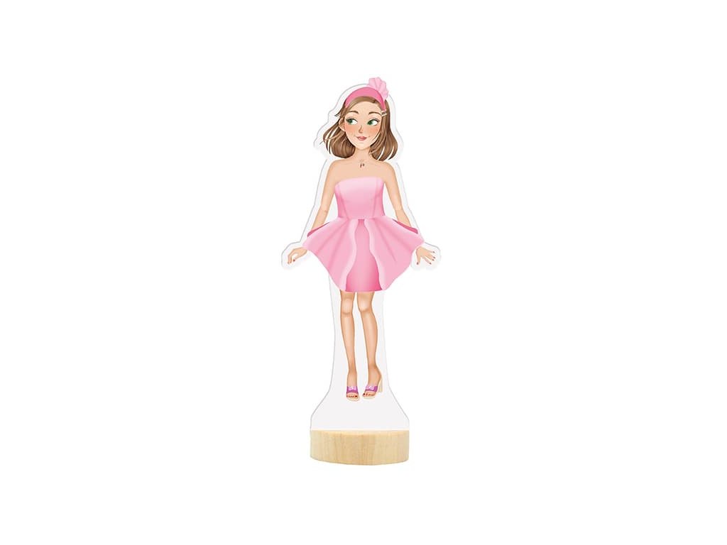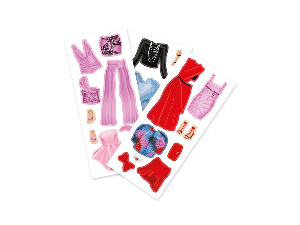 Balenie obsahuje obliekaciu postavičku, 3 hárky magnetických častí oblečenia, topánok a doplnkov a drevený podstavec.