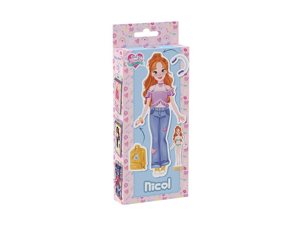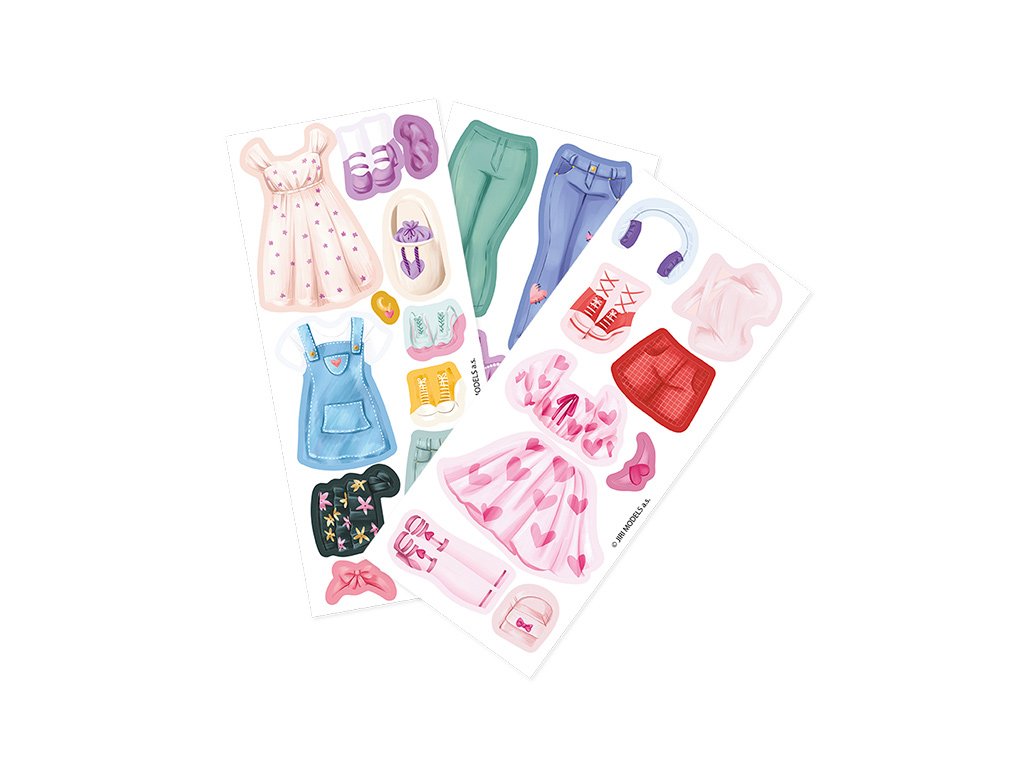 Balenie obsahuje obliekaciu postavičku, 3 hárky magnetických častí oblečenia, topánok a doplnkov a drevený podstavec.