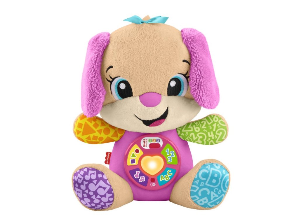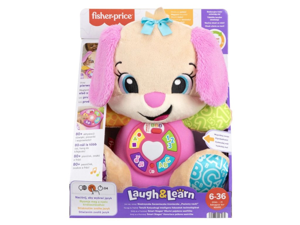 Hovoriaca psíkova sestrička Smart Stages® od Fisher-Price® je skvelá interaktívna plyšová hračka, ktorá spojuje zábavu s učením. Vďaka 5 tlačidlám na brušku môžu deti stlačením počúvať viac ako 80 piesní, zvukov a fráz, ktoré pomáhajú rozvíjať jazykové schopnosti a poznávanie nových vecí. Srdiečko na brušku sa rozsvieti v rôznych farbách, čo ešte viac upúta pozornosť malých objaviteľov.