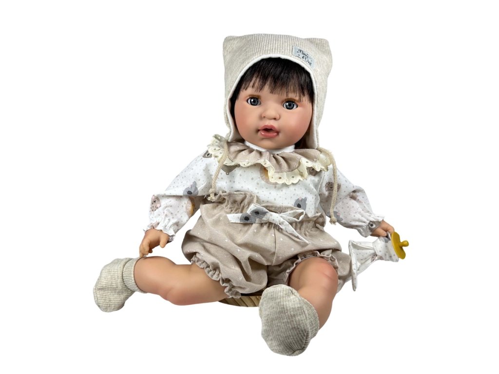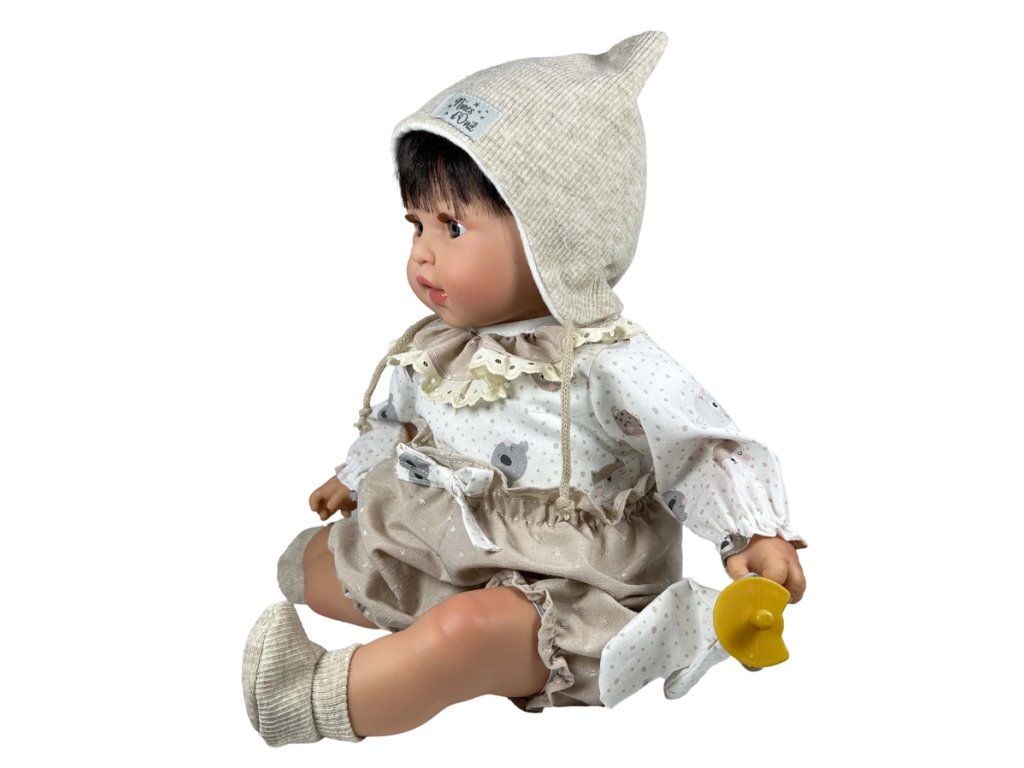Biela bábika s hnedými vlasmi a modrými očkami. Má látkové telo a gumené ručičky a nožičky a nosí biele tričko so zvieracou potlačou, béžové nohavice, čiapku a papuče. Dodáva sa s cumlíkom a v plátennom vrecúšku.