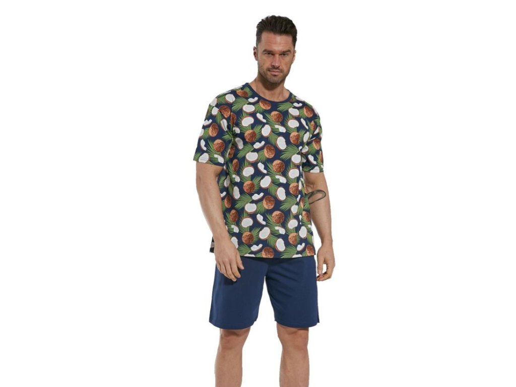 Pyžamo pre mužov na pokojné sny. Pyžamo od módnej značky Cornette s krátkym rukávom a kraťasmi. Tmavomodré tričko je celé posýte obrázky kokosu. Jednofarebné kraťasy sú v páse do prešitej gumy. Pánske pyžamo Cornette krátky rukáv je vyrobené z vyskokvalitnej bavlny.