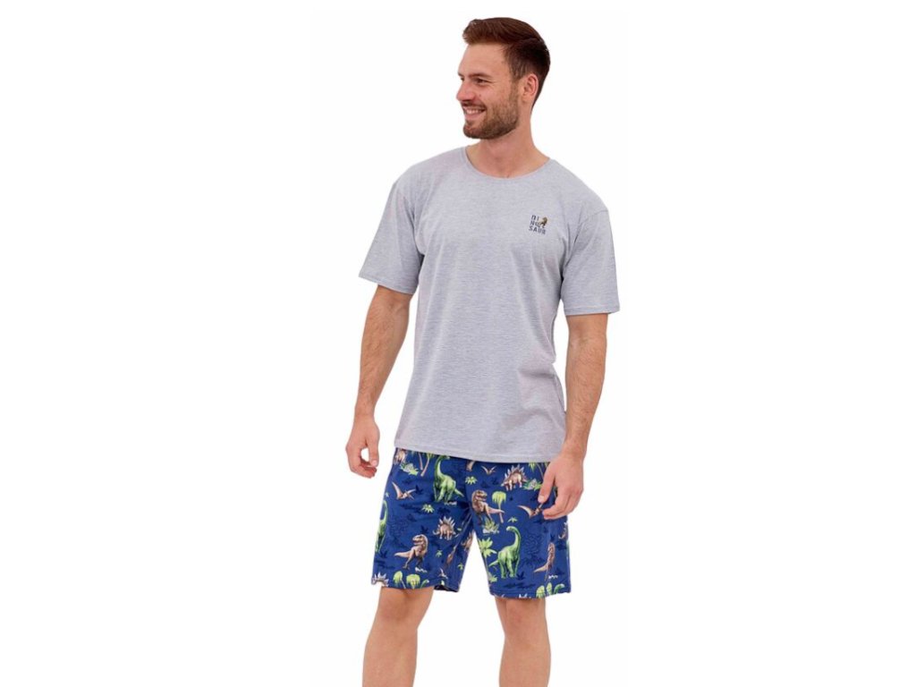 Bavlnené pyžamo pre mužov s krátkym rukávom. Pánske krátke pyžamo s potlačou je pohodlné nočné oblečenie určené na teplejšie obdobie alebo pre tých, ktorí preferujú ľahší a vzdušnejší štýl spania. Toto pyžamo obvykle zahŕňa krátke rukávy a šortky, čo poskytuje voľnosť pohybu a priedušnosť počas spánku. Bavlnené šedé tričko s klasickým okrúhlym výstrihom a decentným nápisom na hrudníku. Nohavice sú modré s farebnými obrázkami dinosaurov. V páse sú do širšej gumy. Pánske pyžamo Cornette krátky rukáv je vyrobené z vyskokvalitnej bavlny.