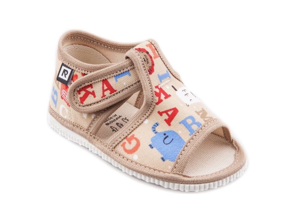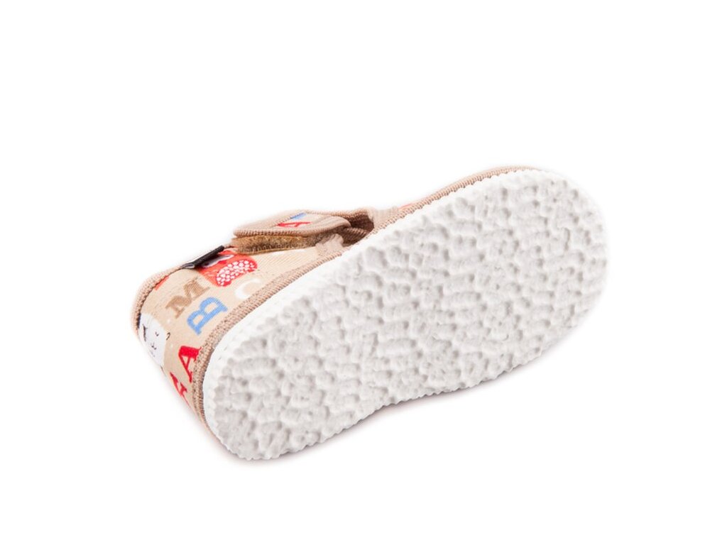 Detské papuče, sandálkového strihu s otvorenou špicou so zapínaním na "suchý zips ". Tvar špičky s dôrazom na typicky detský dominantný palček zabezpečuje dostatočný priestor pre prsty. Papučky sú ľahké, pružné, vyrobené z textilu ( zo 100% bavlny ), ktorý zabezpečuje priedušnosť a dokonalú prispôsobilosť tvaru nohy. Stielka papučky je v časti klenku vyplnená penovým materiálom, čo zabezpečuje dieťaťu pohodlnú chôdzu a podporuje zdravý vývoj nohy. Papučky sú určené do interiéru ako prezúvková obuv. Je zdravotne a hygienicky nezávadná. Obuv sa ako nová môže na hladkých povrchoch šmýkať ( keramická dlažba, laminátová podlaha...) Na takéto povrchy je vhodnejšia obuv z našej ponuky pod označením inovatívne a flexi papuče. V rámci licenčného oprávnenia na používanie ochrannej známky Žirafa a Česká kvalita bola posudzovaná komisiou odborníkov a detského ortopéda.