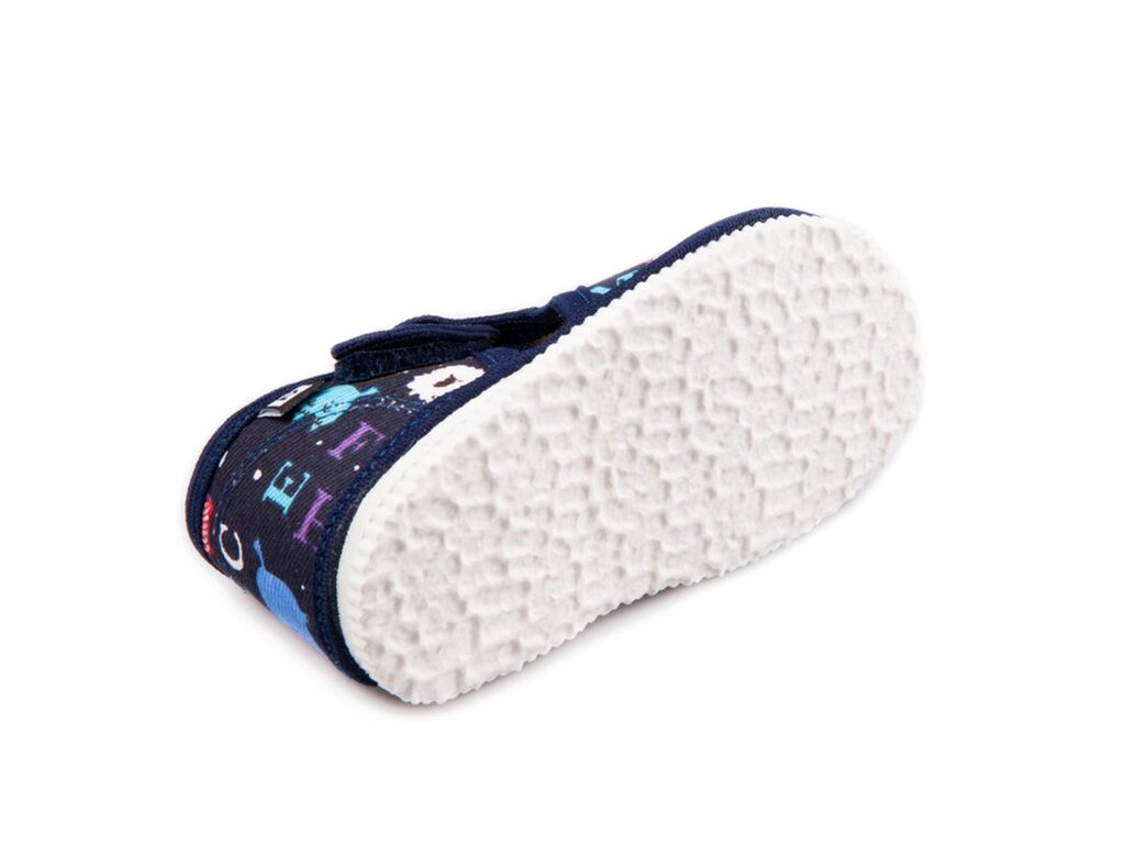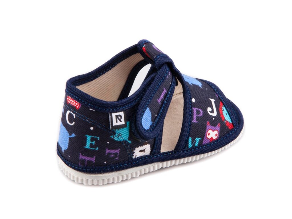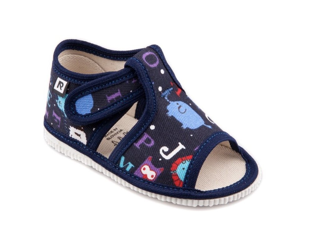 Detské papuče, sandálkového strihu s otvorenou špicou so zapínaním na "suchý zips ". Tvar špičky s dôrazom na typicky detský dominantný palček zabezpečuje dostatočný priestor pre prsty. Papučky sú ľahké, pružné, vyrobené z textilu ( zo 100% bavlny ), ktorý zabezpečuje priedušnosť a dokonalú prispôsobilosť tvaru nohy. Stielka papučky je v časti klenku vyplnená penovým materiálom, čo zabezpečuje dieťaťu pohodlnú chôdzu a podporuje zdravý vývoj nohy. Papučky sú určené do interiéru ako prezúvková obuv. Je zdravotne a hygienicky nezávadná. Obuv sa ako nová môže na hladkých povrchoch šmýkať ( keramická dlažba, laminátová podlaha...) Na takéto povrchy je vhodnejšia obuv z našej ponuky pod označením inovatívne a flexi papuče. V rámci licenčného oprávnenia na používanie ochrannej známky Žirafa a Česká kvalita bola posudzovaná komisiou odborníkov a detského ortopéda. Papuče prezuvky RAK sú najlepšia voľba pre vaše dieťa.