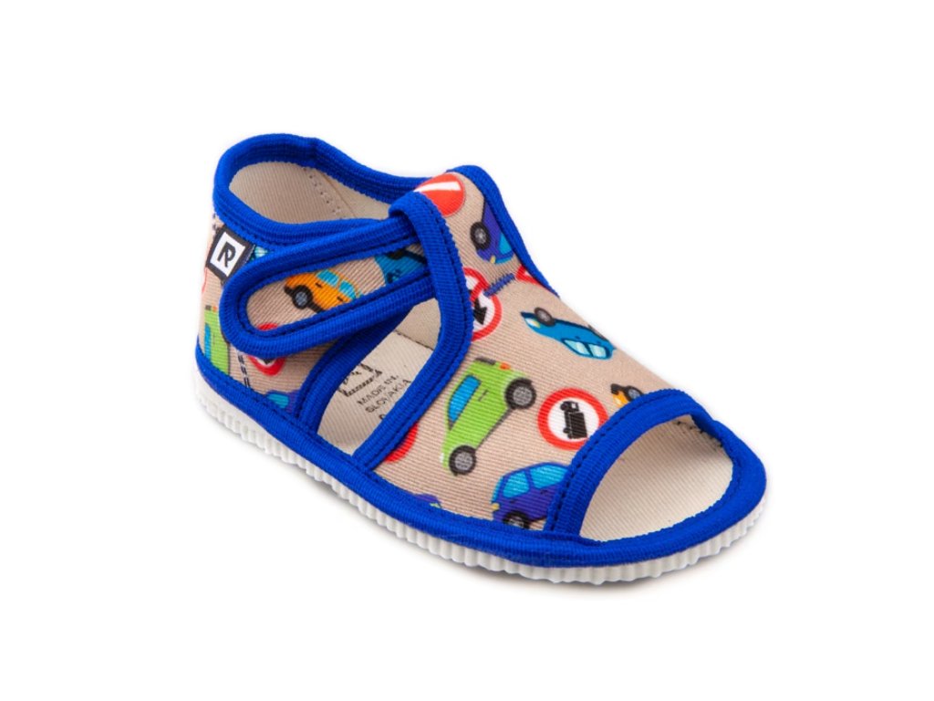 Detské papuče, sandálkového strihu s otvorenou špicou so zapínaním na "suchý zips ". Tvar špičky s dôrazom na typicky detský dominantný palček zabezpečuje dostatočný priestor pre prsty. Papučky sú ľahké, pružné, vyrobené z textilu ( zo 100% bavlny ), ktorý zabezpečuje priedušnosť a dokonalú prispôsobilosť tvaru nohy. Stielka papučky je v časti klenku vyplnená penovým materiálom, čo zabezpečuje dieťaťu pohodlnú chôdzu a podporuje zdravý vývoj nohy. Papučky sú určené do interiéru ako prezúvková obuv. Je zdravotne a hygienicky nezávadná. Obuv sa ako nová môže na hladkých povrchoch šmýkať ( keramická dlažba, laminátová podlaha...) Na takéto povrchy je vhodnejšia obuv z našej ponuky pod označením inovatívne a flexi papuče. V rámci licenčného oprávnenia na používanie ochrannej známky Žirafa a Česká kvalita bola posudzovaná komisiou odborníkov a detského ortopéda. Papuče prezuvky RAK sú najlepšia voľba pre vaše dieťa.