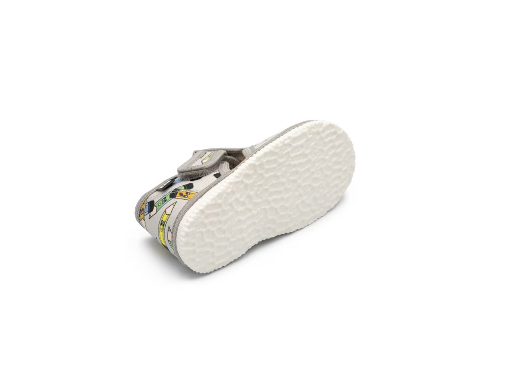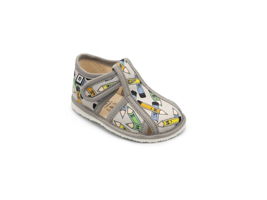 Detské papuče, sandálkového strihu s uzavretou špicou so zapínaním na "suchý zips ". Tvar špičky s dôrazom na typicky detský dominantný palček zabezpečuje dostatočný priestor pre prsty. Papučky sú ľahké, pružné, vyrobené z textilu ( zo 100% bavlny ), ktorý zabezpečuje priedušnosť a dokonalú prispôsobilosť tvaru nohy. Stielka papučky je v časti klenku vyplnená penovým materiálom, čo zabezpečuje dieťaťu pohodlnú chôdzu a podporuje zdravý vývoj nohy. Obuv je určená do interiéru ako prezúvková obuv. Je zdravotne a hygienicky nezávadná. Obuv sa ako nová môže na hladkých povrchoch šmýkať ( keramická dlažba, laminátová podlaha...) Na takéto povrchy je vhodnejšia obuv z našej ponuky pod označením inovatívne a flexi papuče. V rámci licenčného oprávnenia na používanie ochrannej známky Žirafa a Česká kvalita bola posudzovaná komisiou odborníkov a detského ortopéda. Papuče prezuvky RAK sú najlepšia voľba pre vaše dieťa.