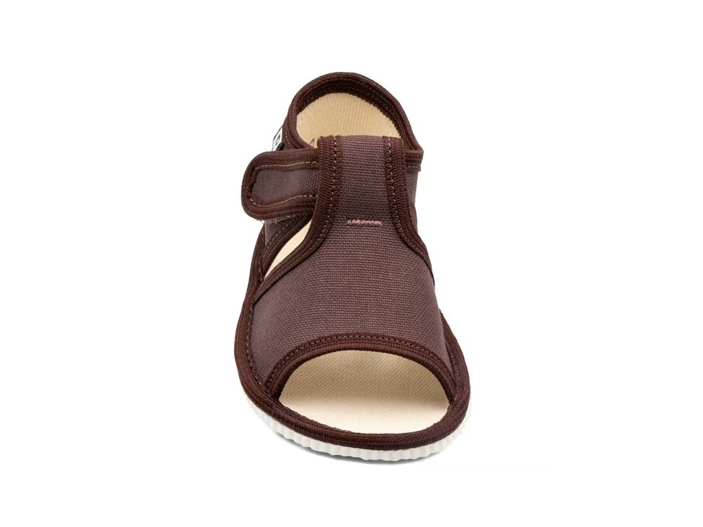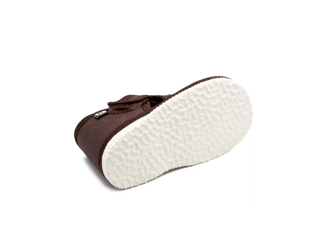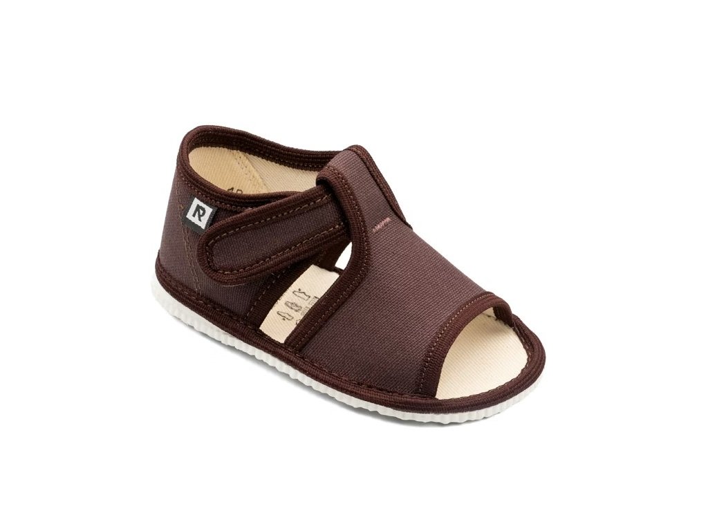 Detské papuče, sandálkového strihu s otvorenou špicou so zapínaním na "suchý zips ". Tvar špičky s dôrazom na typicky detský dominantný palček zabezpečuje dostatočný priestor pre prsty. Papučky sú ľahké, pružné, vyrobené z textilu ( zo 100% bavlny ), ktorý zabezpečuje priedušnosť a dokonalú prispôsobilosť tvaru nohy. Stielka papučky je v časti klenku vyplnená penovým materiálom, čo zabezpečuje dieťaťu pohodlnú chôdzu a podporuje zdravý vývoj nohy. Papučky sú určené do interiéru ako prezúvková obuv. Je zdravotne a hygienicky nezávadná. Obuv sa ako nová môže na hladkých povrchoch šmýkať ( keramická dlažba, laminátová podlaha...) Na takéto povrchy je vhodnejšia obuv z našej ponuky pod označením inovatívne a flexi papuče. V rámci licenčného oprávnenia na používanie ochrannej známky Žirafa a Česká kvalita bola posudzovaná komisiou odborníkov a detského ortopéda. Papuče prezuvky RAK sú najlepšia voľba pre vaše dieťa.