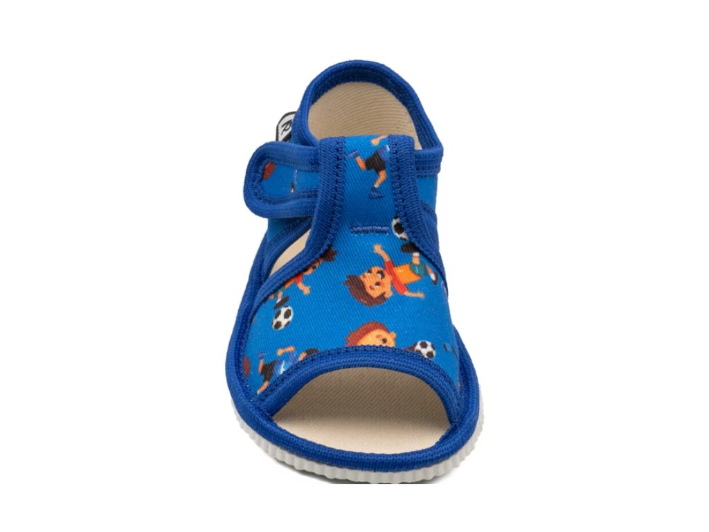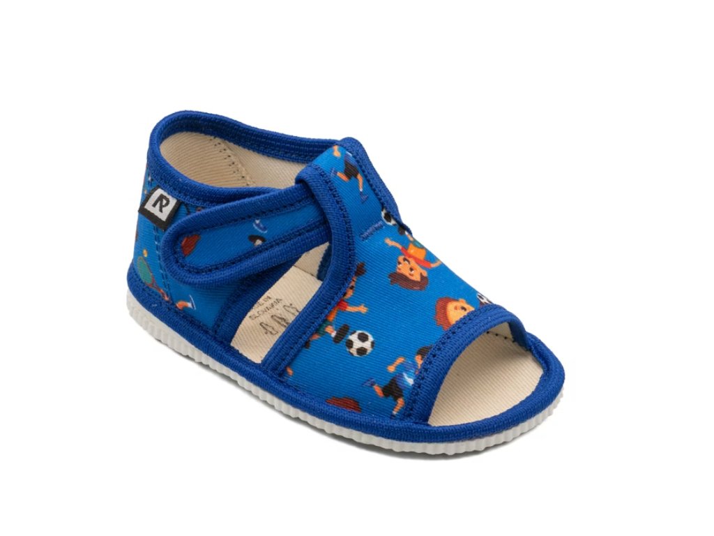 Detské papuče, sandálkového strihu s otvorenou špicou so zapínaním na "suchý zips ". Tvar špičky s dôrazom na typicky detský dominantný palček zabezpečuje dostatočný priestor pre prsty. Papučky sú ľahké, pružné, vyrobené z textilu ( zo 100% bavlny ), ktorý zabezpečuje priedušnosť a dokonalú prispôsobilosť tvaru nohy. Stielka papučky je v časti klenku vyplnená penovým materiálom, čo zabezpečuje dieťaťu pohodlnú chôdzu a podporuje zdravý vývoj nohy. Papučky sú určené do interiéru ako prezúvková obuv. Je zdravotne a hygienicky nezávadná. Obuv sa ako nová môže na hladkých povrchoch šmýkať ( keramická dlažba, laminátová podlaha...) Na takéto povrchy je vhodnejšia obuv z našej ponuky pod označením inovatívne a flexi papuče. V rámci licenčného oprávnenia na používanie ochrannej známky Žirafa a Česká kvalita bola posudzovaná komisiou odborníkov a detského ortopéda. Papuče prezuvky RAK sú najlepšia voľba pre vaše dieťa.