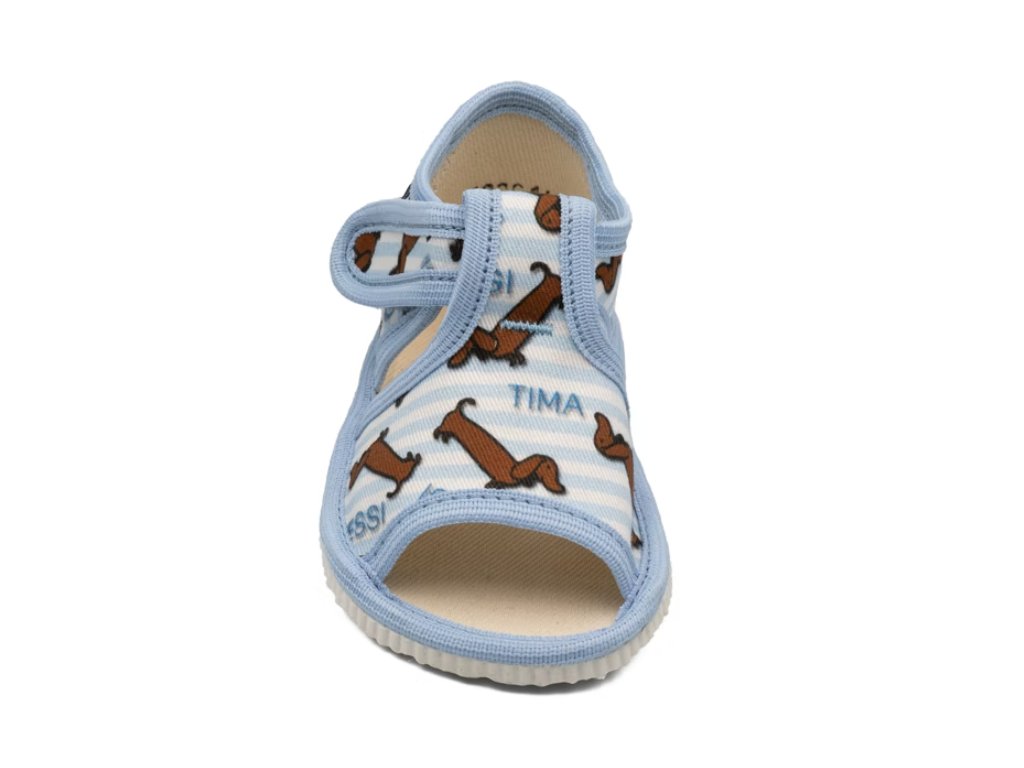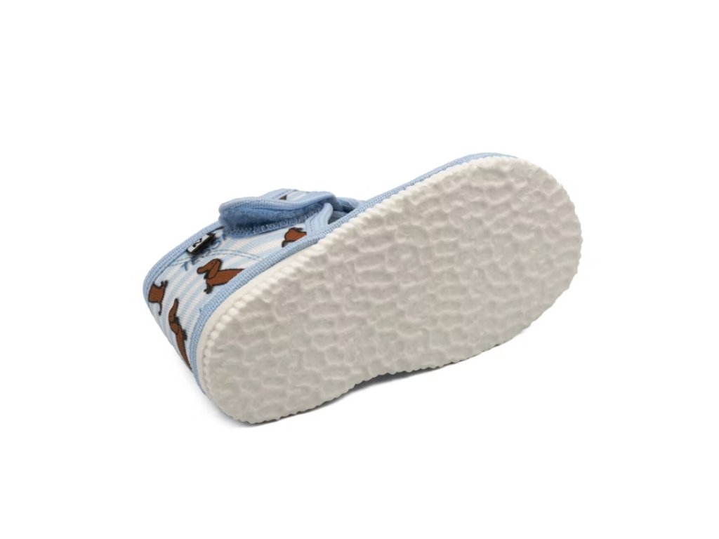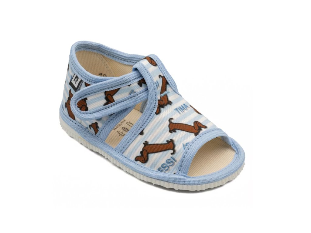 Detské papuče, sandálkového strihu s otvorenou špicou so zapínaním na "suchý zips ". Tvar špičky s dôrazom na typicky detský dominantný palček zabezpečuje dostatočný priestor pre prsty. Papučky sú ľahké, pružné, vyrobené z textilu ( zo 100% bavlny ), ktorý zabezpečuje priedušnosť a dokonalú prispôsobilosť tvaru nohy. Stielka papučky je v časti klenku vyplnená penovým materiálom, čo zabezpečuje dieťaťu pohodlnú chôdzu a podporuje zdravý vývoj nohy. Papučky sú určené do interiéru ako prezúvková obuv. Je zdravotne a hygienicky nezávadná. Obuv sa ako nová môže na hladkých povrchoch šmýkať ( keramická dlažba, laminátová podlaha...) Na takéto povrchy je vhodnejšia obuv z našej ponuky pod označením inovatívne a flexi papuče. V rámci licenčného oprávnenia na používanie ochrannej známky Žirafa a Česká kvalita bola posudzovaná komisiou odborníkov a detského ortopéda. Papuče prezuvky RAK sú najlepšia voľba pre vaše dieťa.