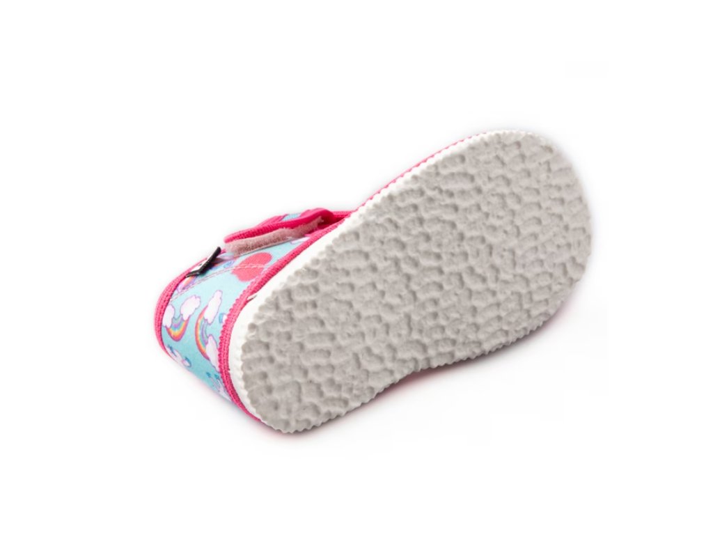 Detské papuče, sandálkového strihu s otvorenou špicou so zapínaním na "suchý zips ". Tvar špičky s dôrazom na typicky detský dominantný palček zabezpečuje dostatočný priestor pre prsty. Papučky sú ľahké, pružné, vyrobené z textilu ( zo 100% bavlny ), ktorý zabezpečuje priedušnosť a dokonalú prispôsobilosť tvaru nohy. Stielka papučky je v časti klenku vyplnená penovým materiálom, čo zabezpečuje dieťaťu pohodlnú chôdzu a podporuje zdravý vývoj nohy. Papučky sú určené do interiéru ako prezúvková obuv. Je zdravotne a hygienicky nezávadná. Obuv sa ako nová môže na hladkých povrchoch šmýkať ( keramická dlažba, laminátová podlaha...) Na takéto povrchy je vhodnejšia obuv z našej ponuky pod označením inovatívne a flexi papuče. V rámci licenčného oprávnenia na používanie ochrannej známky Žirafa a Česká kvalita bola posudzovaná komisiou odborníkov a detského ortopéda. Papuče prezuvky RAK sú najlepšia voľba pre vaše dieťa.