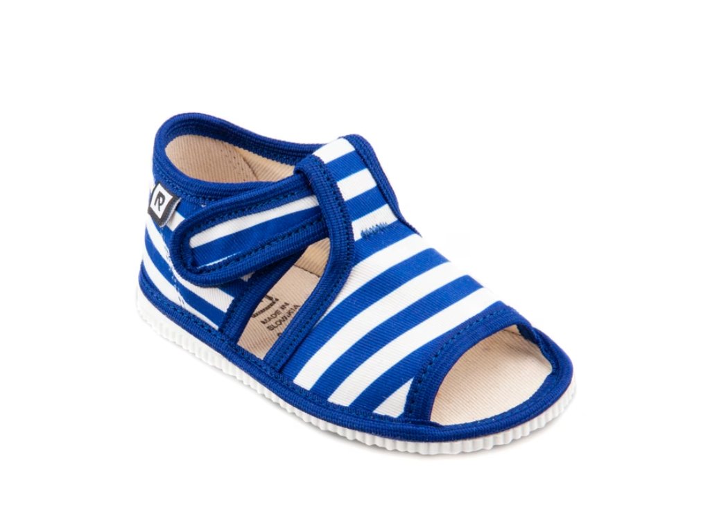 Detské papuče, sandálkového strihu s otvorenou špicou so zapínaním na "suchý zips ". Tvar špičky s dôrazom na typicky detský dominantný palček zabezpečuje dostatočný priestor pre prsty. Papučky sú ľahké, pružné, vyrobené z textilu ( zo 100% bavlny ), ktorý zabezpečuje priedušnosť a dokonalú prispôsobilosť tvaru nohy. Stielka papučky je v časti klenku vyplnená penovým materiálom, čo zabezpečuje dieťaťu pohodlnú chôdzu a podporuje zdravý vývoj nohy. Papučky sú určené do interiéru ako prezúvková obuv. Je zdravotne a hygienicky nezávadná. Obuv sa ako nová môže na hladkých povrchoch šmýkať ( keramická dlažba, laminátová podlaha...) Na takéto povrchy je vhodnejšia obuv z našej ponuky pod označením inovatívne a flexi papuče. V rámci licenčného oprávnenia na používanie ochrannej známky Žirafa a Česká kvalita bola posudzovaná komisiou odborníkov a detského ortopéda. Papuče prezuvky RAK sú najlepšia voľba pre vaše dieťa.