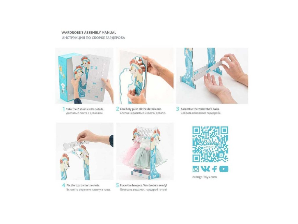 Psík je balený v pekne zdobenej darčekovej krabici, na ktorej dne sú kartónové diely, z ktorých si po vybratí môžete zostaviť vešiak na oblečky so štyrmi ramienkami.