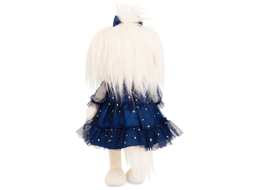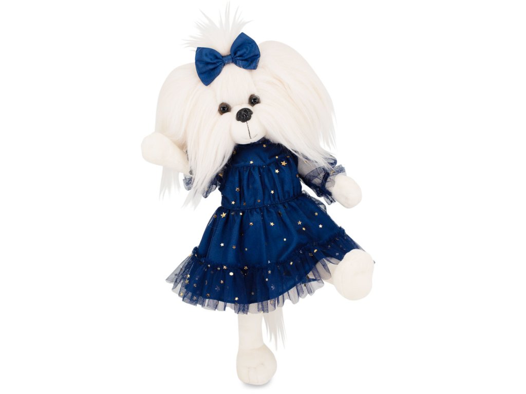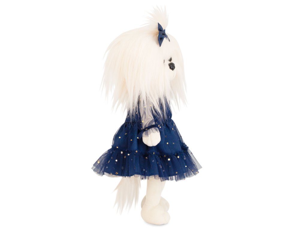 Roztomilá a štýlová maltézska fenka Mimi z kolekcie Lucky Doggy je ideálnou plyšovou kamarátkou pre všetky malé milovníčky psíkov, módy a fantázie. Tento luxusný plyšový psík od značky Orange Toys je vyrobený z mäkučkého, kvalitného materiálu, ktorý je príjemný na dotyk a bezpečný pre deti. Mimi má na sebe elegantné tmavomodré tylové šaty posiate hviezdami a modrú mašľu vo vláskoch, vďaka čomu pôsobí ako skutočná hviezda večera. Deti ju môžu jednoducho prezliekať do iných oblečkov z kolekcie Lucky Doggy a rozvíjať tak svoju fantáziu a kreativitu. Vďaka vnútornej kostričke dokáže Mimi otáčať hlavičkou a hýbať labkami – správa sa ako malá bábika! Súčasťou balenia je aj kartónová šatňa, do ktorej si deti môžu zavesiť šaty svojej novej kamarátky.