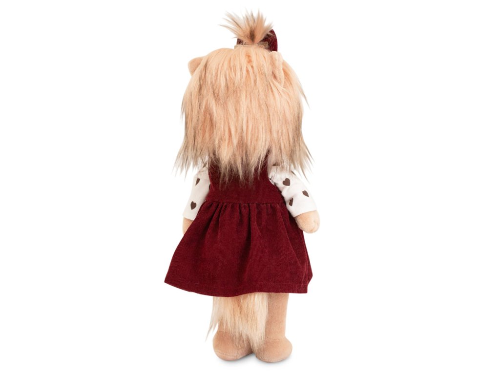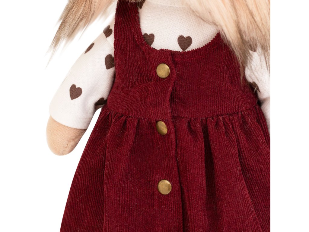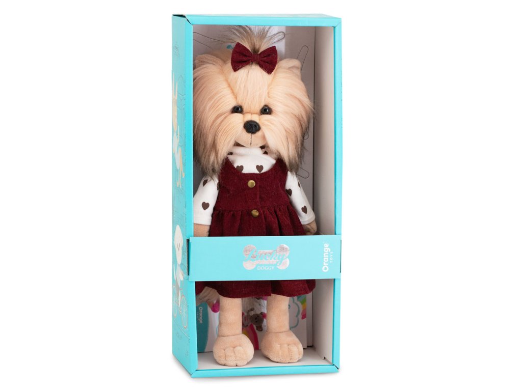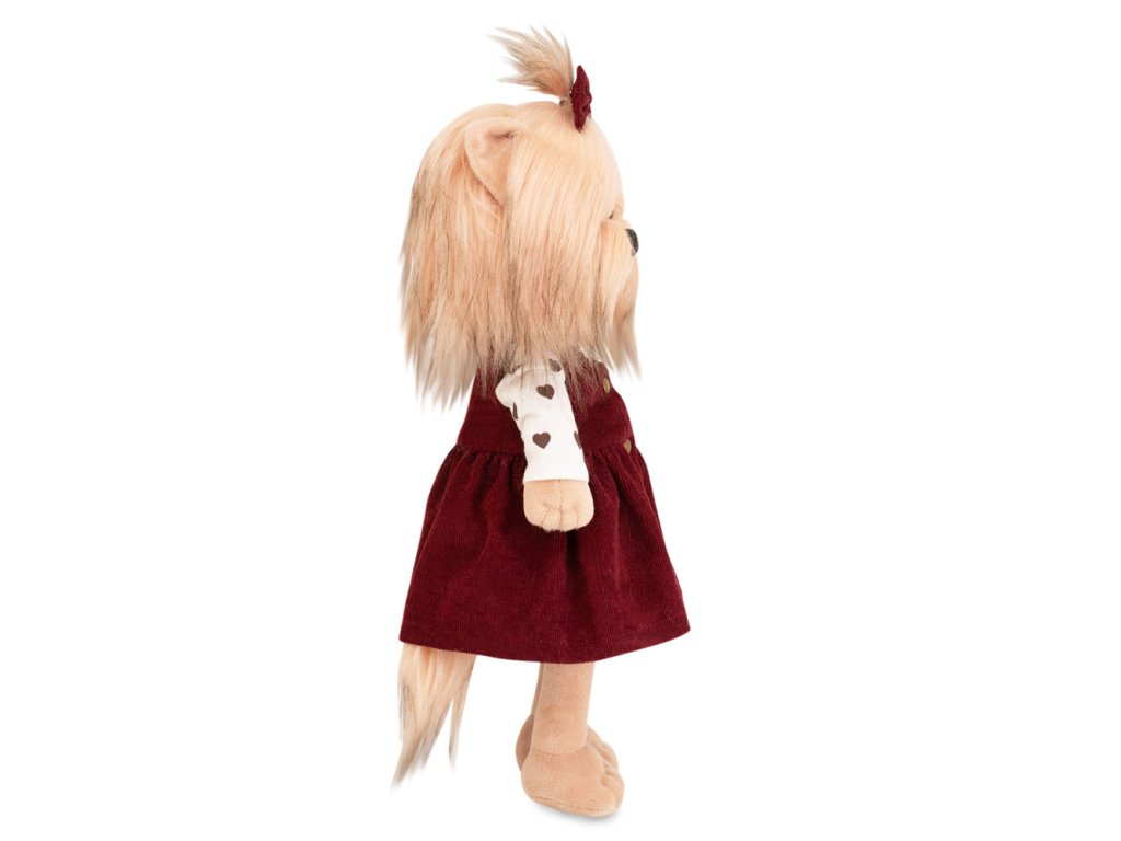 výška psíka je 38 cm. Oblečené má biele tričko s čiernymi srdiečkami a bordové šaty na traky s hnedými gombíkmi. Na hlave má mašličku.