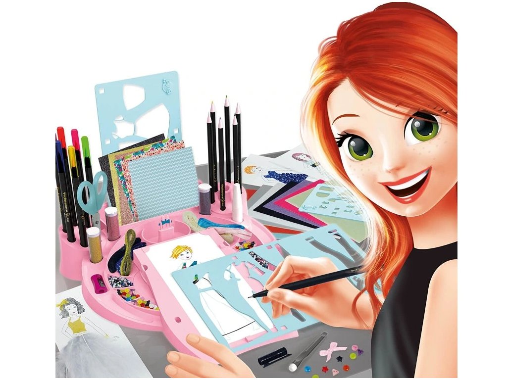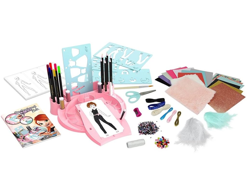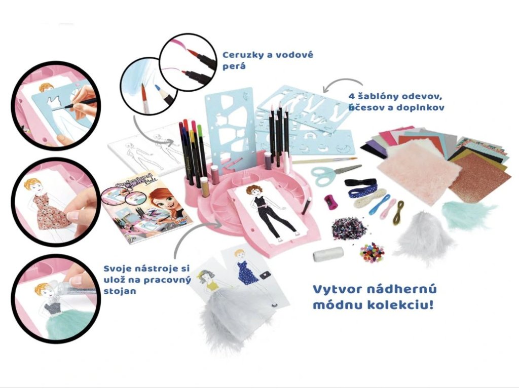 Vyberte si svoju predlohu, navrhnite oblečenie podľa šablón a potom ich vyplňte pomocou množstva rôzneho príslušenstva, ktoré nájdete v balení.