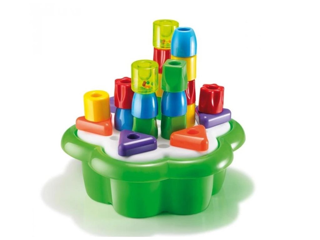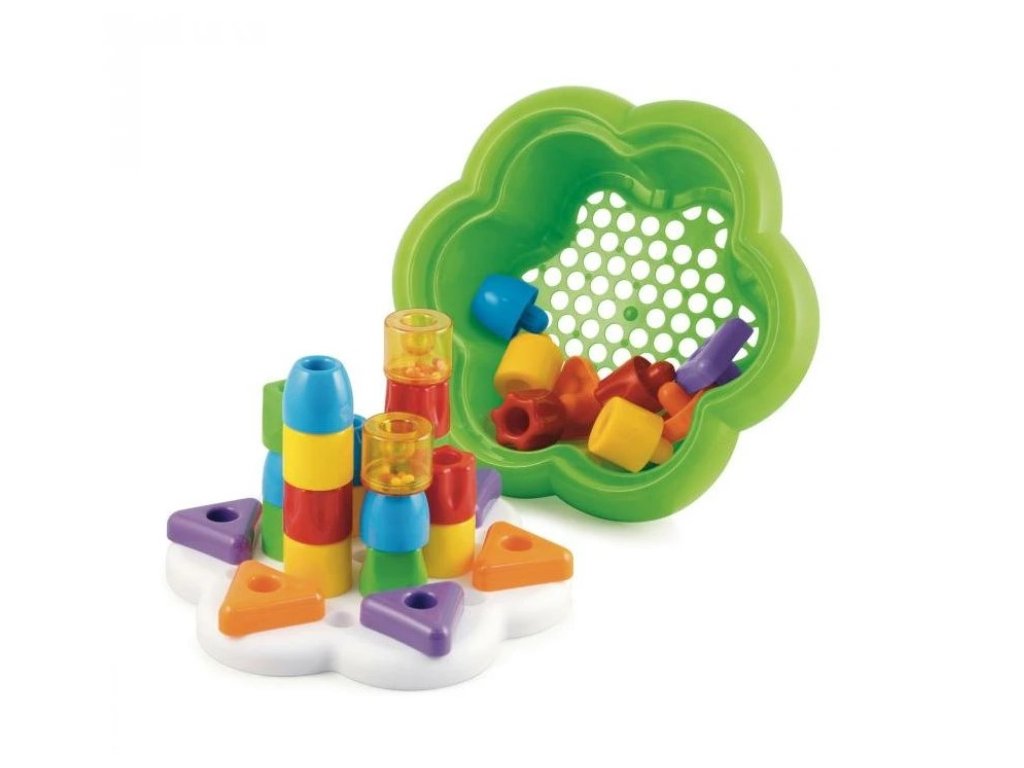 Mozaiková stavebnica rozvíjajúca jemnú motoriku, tvorivosť a schopnosť rozoznávať farby a tvary. Deti vkladajú jednotlivé diely do podložky a vytvárajú tak svoje prvé mozaikové obrazce alebo stavajú na podložke rôzne výškové stavby. Po skončení hry je možné celú súpravu uložiť do úhľadnej schránky v tvare kvetiny. Podložka je z mäkkého ohybného plastu špičkovej kvality a všetky diely sú umývateľné. Stavebnica obsahuje 28 dielov a je určená pre deti od 1 roku.