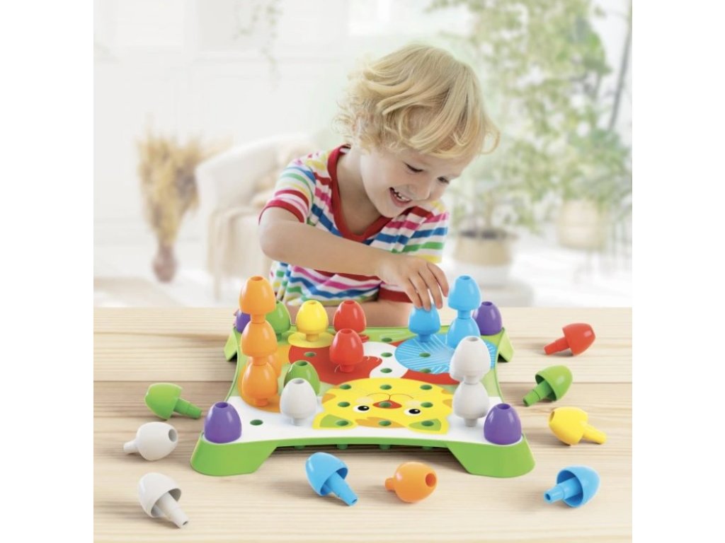 Výborná didaktická mozaika určená deťom od 2 rokov. Veľké farebné, stohovateľné hríbiky podnecujú na tvorbu prvých mozaík alebo stavbu vysokých veží. Skvelá hra, ktorá podnecuje kreativitu a manuálnu zručnosť. Obsah balenia: 1 plastová základňa 3 obojstranne ilustrované perforované karty 40 farebných plastových hríbikov