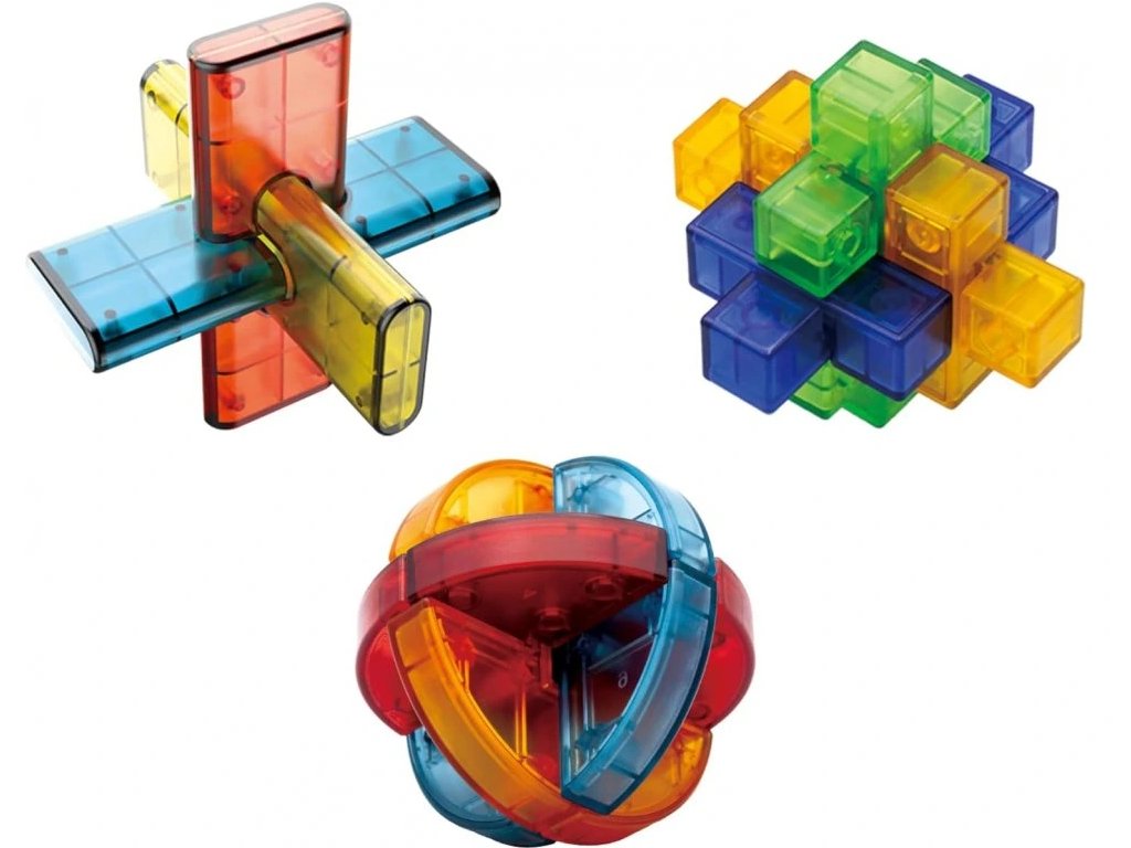 - Tri tradičné hlavolamy: Každý hlavolam je navrhnutý tak, aby ste odhalili tajný mechanizmus, ktorý ich drží pohromade. Najprv ich rozoberte a potom sa pokúste zložiť ich späť.