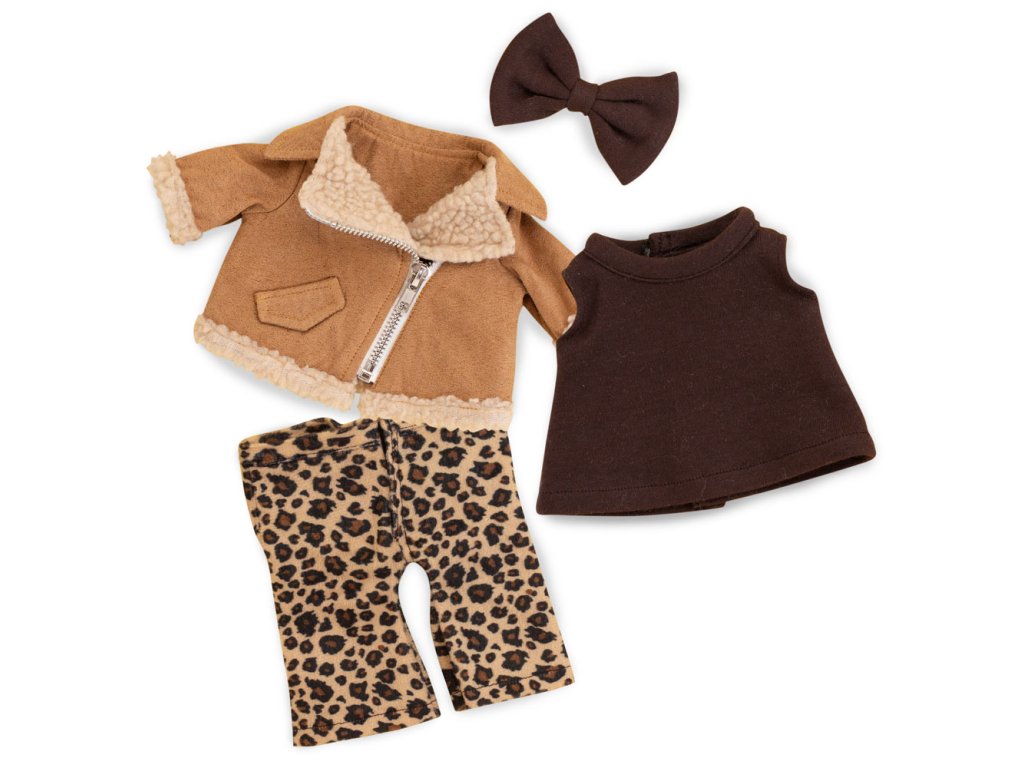 Sada obsahuje: Zimnú bundu s kožúškom, hnedé tričko s mašľou na hlavu a leopardie nohavice.