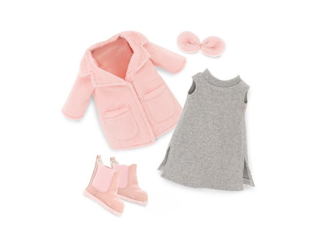 Obleček sa skladá z hebkého ružového kabátika, mašličky, zimných topánok a šedého svetríka bez rukávov.