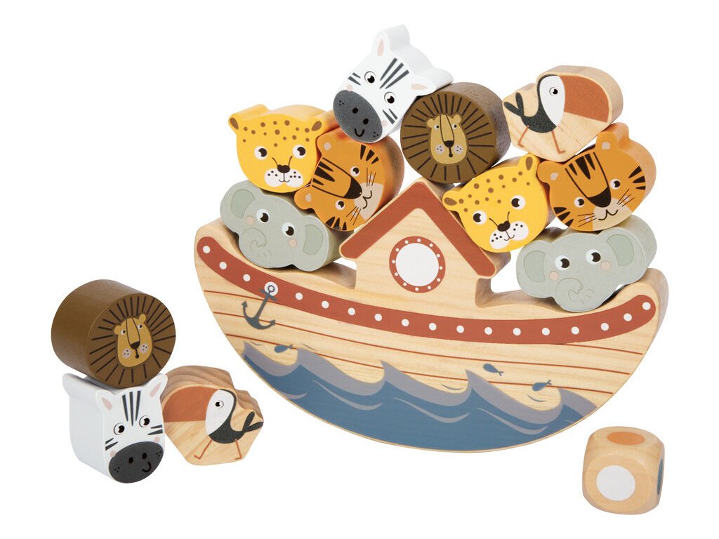 Vybalansujete vratkú loďku a zachránite pred potopou všetky zvieratká? Hádžte kockou a ukladajte dieliky príslušných farieb s motívmi roztomilých zvierat na základňu v podobe rozhojdanej lode. Rozvíjajte hrou koordináciu rúk a zraku či trpezlivosť. Hračka je veľmi robustná a odolná, vyrobená z masívneho dreva a vyvedená v atraktívnej farebnej schéme produktového radu Small Foot Safari.