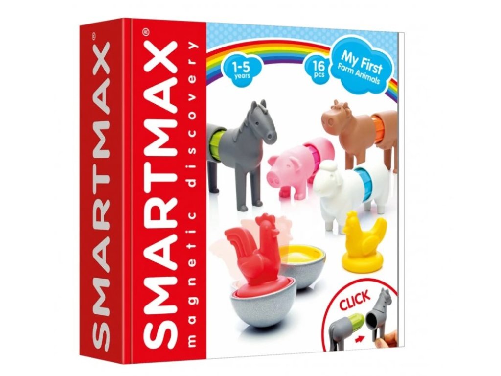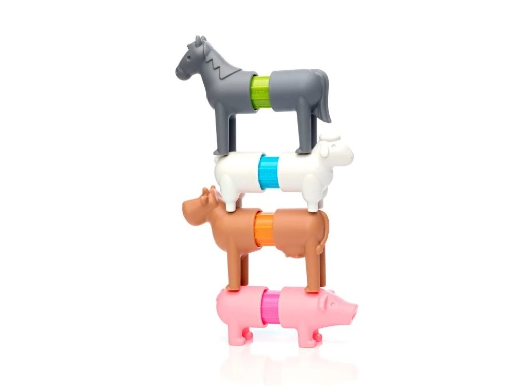 Ideálna jednoduchá stavebnica pre malé deti od 1 roka využíva k spájaniu jednotlivých častí magnetizmus. Deti si vždy z troch častí postavia 6 zvieratiek - koníka, prasiatko, ovcu, kravičku a 2 sliepočky.Zvieratá sa skladajú z troch dielov, na tyčku deti navlečú prednú a zadnú časť tela. Môžu si tak vytvárať zvieratá reálne alebo diely rôzne skombinovať a vytvoriť zvieratá fantastické. Dieliky sú dostatočne veľké, príjemné a jednoduché na manipuláciu. Balenie obsahuje celkovo 16 dielikov.