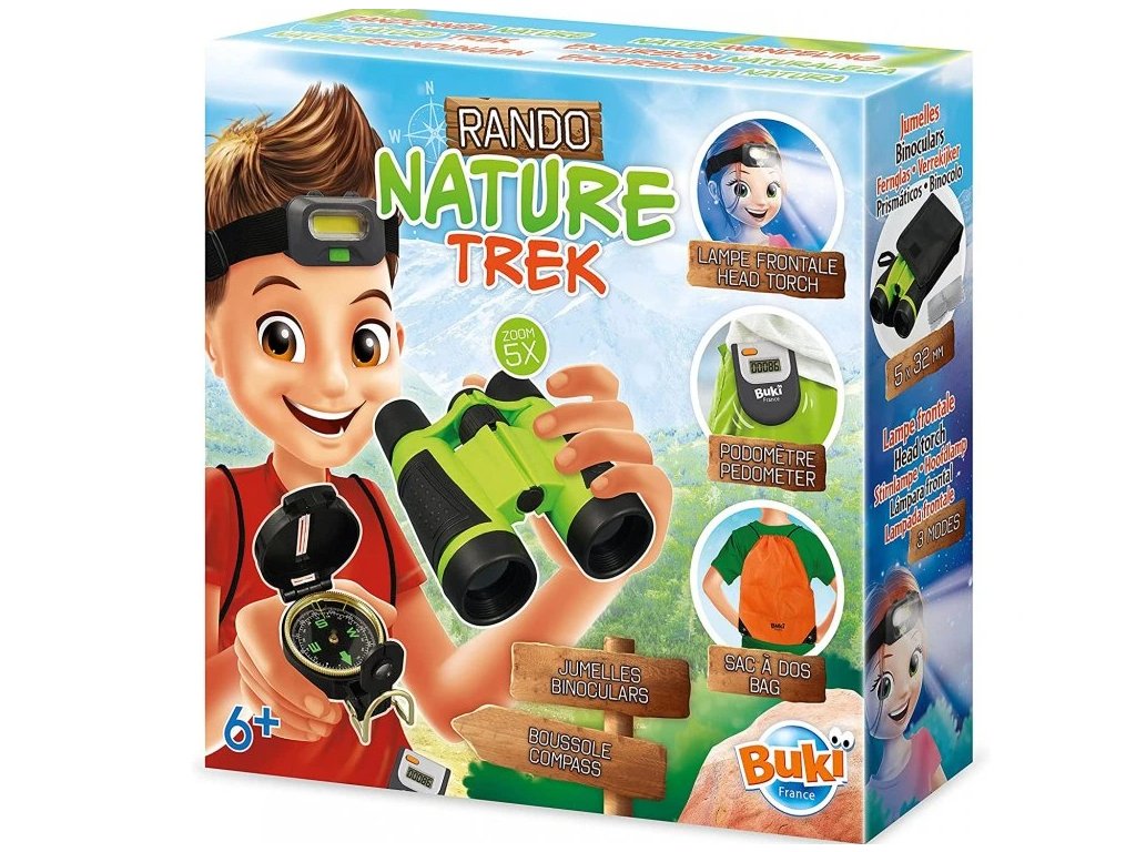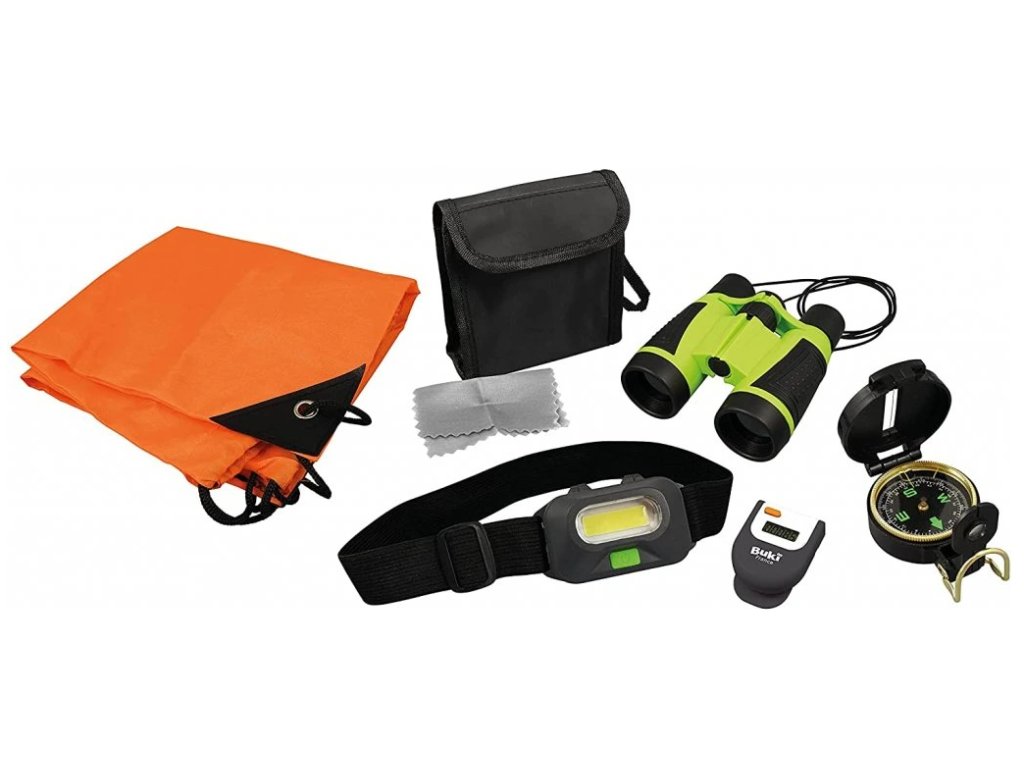Treková súprava pre malých cestovateľov a výletníkov. Ďalekohľad, kompas, čelovka, krokomer a vak na chrbát. Ideálne na výlety a vychádzky do prírody.