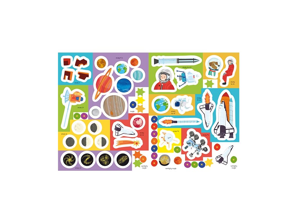 Samolepková knižka obsahuje 48 strán plných informácií a zábavných aktivít a viac ako 100 samoliepek , z ktorých 2 listy svietia v tme.