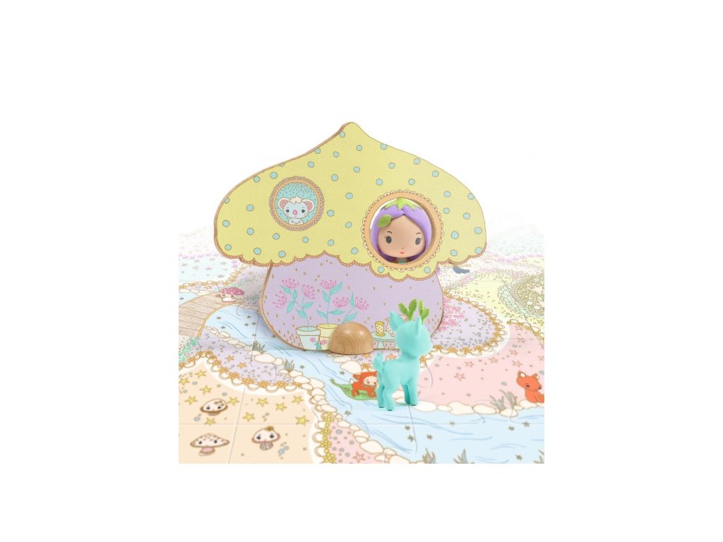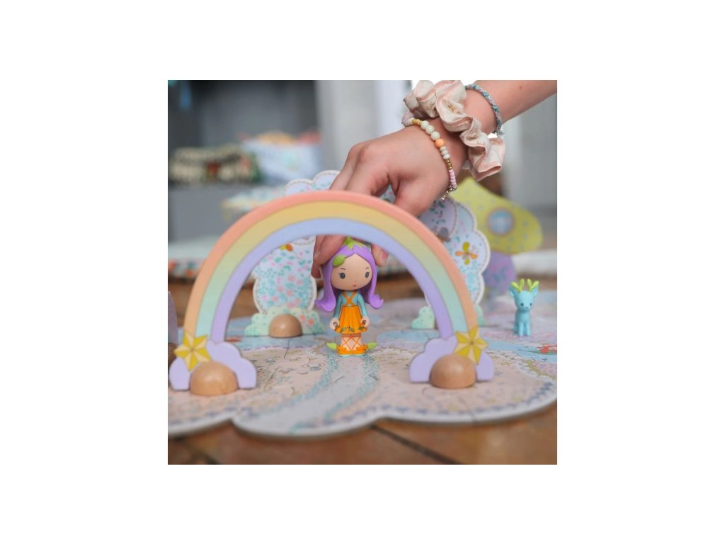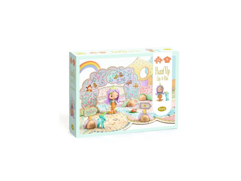 Tinyly Puzzl’Up – Elfka Lily a kúzelný svet je originálne podlahové puzzle, ktoré spája skladanie obrázka s tvorbou priestorovej (3D) rozprávkovej scény. Dieťa najprv poskladá veľký ilustrovaný podklad a potom doň doplní zvislé prvky na drevených podstavcoch – vďaka nim svet Tinyly „ožije“ a pozýva k hre.