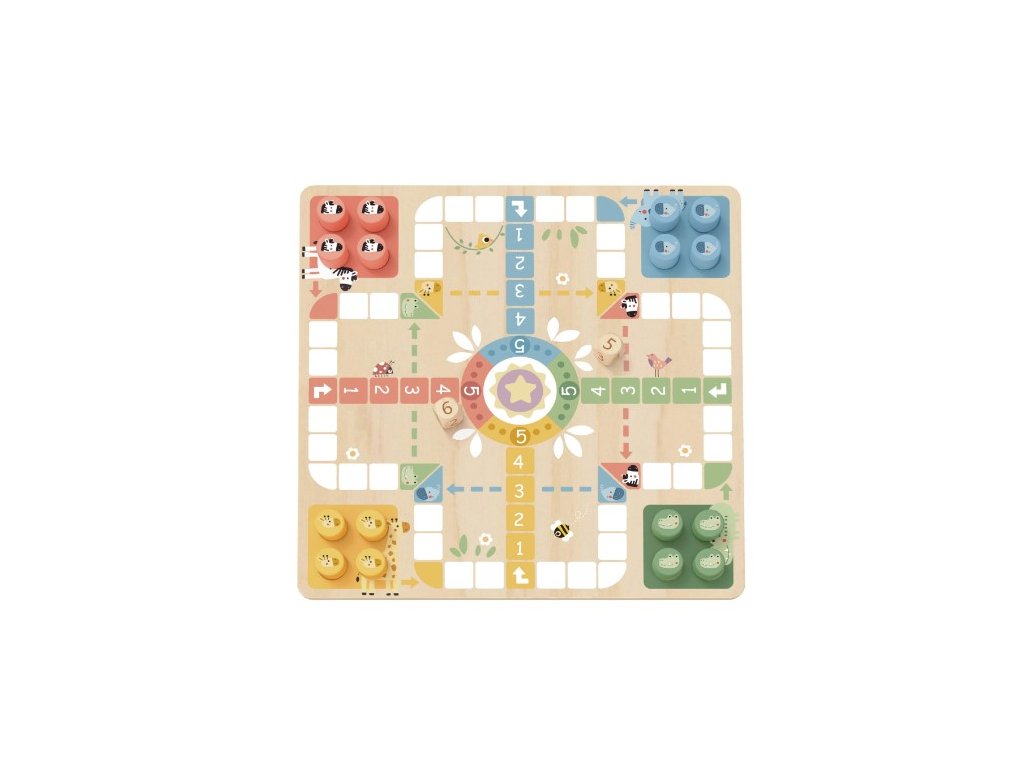 Obojstranná drevená spoločenská hra od Took Toy v pastelových farbách nesmie chýbať v žiadnej domácnosti. Z jednej strany herného plánu nájdete klasiku Človeče, nehnevaj sa. Môžete si vyberať medzi postavičkami slonov, zebier, žiráf či krokodýlov. Z druhej strany hernej dosky je ďalšia klasika - hra Hady a rebríky.