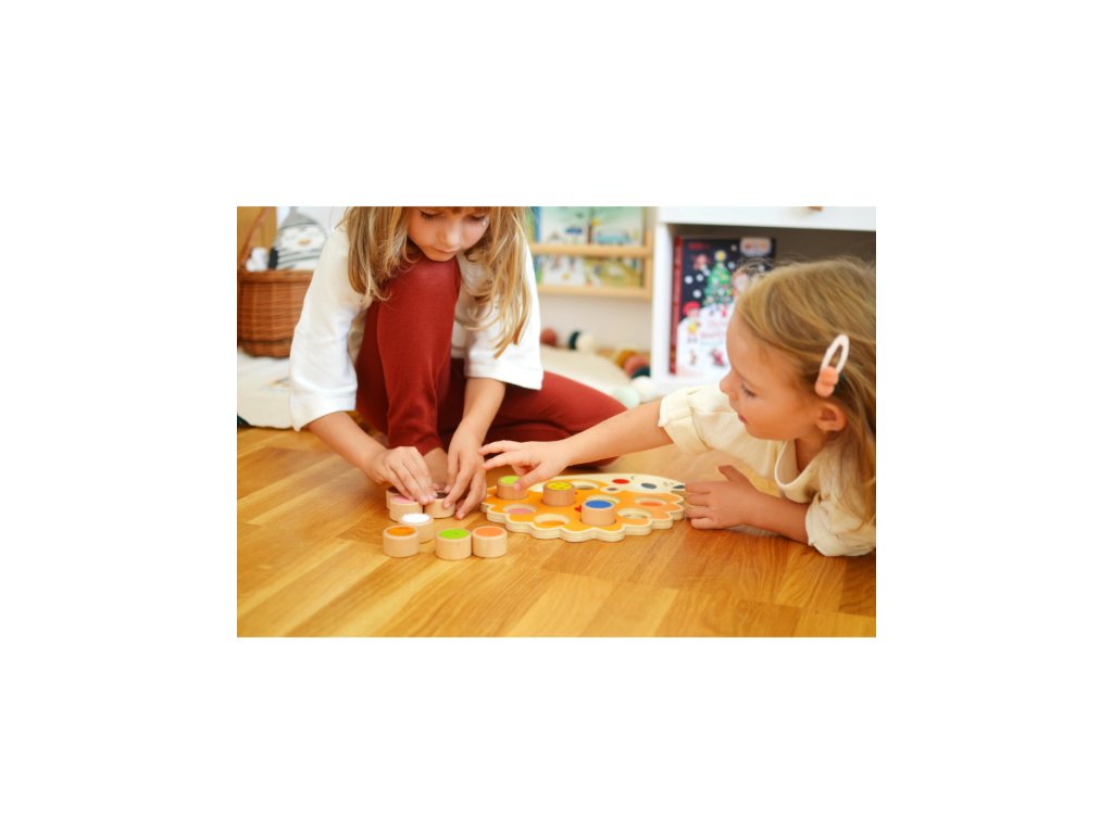 Na desiatich valčekoch sa nachádza desať rôznych druhov materiálov a povrchov, rovnako ako na drevenej podložke v tvare ježka. Úlohou dieťaťa je rozpoznať hmatom jednotlivé materiály a priradiť drevené valčeky do príslušných otvorov na ježkovi.