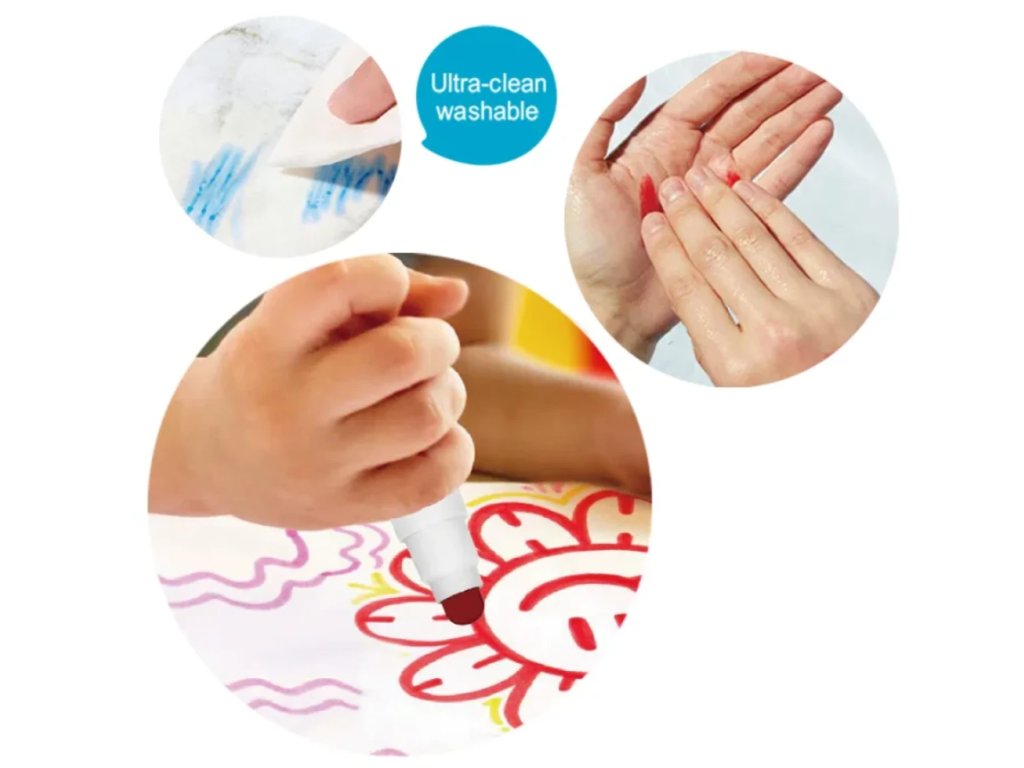 Veľkosť zmývateľných fixiek pre najmenších je prispôsobená na držanie v malých detských rukách. Okrem toho nemusíte ani mať obavu, že narobia neporiadok. Farby sa dajú umyť z ručičiek, vyprať z trička alebo utrieť zo stola. Fixy pre deti sú uložené v praktickom valcovitom boxe, ktorý si deti vezmú ľahko všade so sebou a po kreslení doň všetky fixky opäť upratajú.