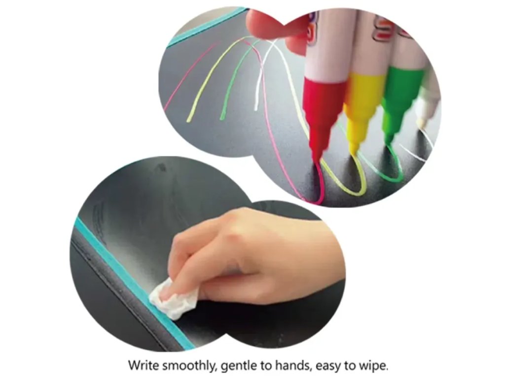 Deti budů mať radosť z kreslenia kriedami v interiéri. Kriedové fixky od Tookyland v 6 sýtych farbách krásne kreslia nielen na tabuľu, ale aj na sklenený povrch. Nezanechávajú žiadny prach a jednoducho sa z povrchu zase zmyjú. S tekutou kriedou ale môžete kresliť aj na pevný papier a ozdobiť tak napríklad zabalené darčeky rôznymi personalizovanými obrázkami.