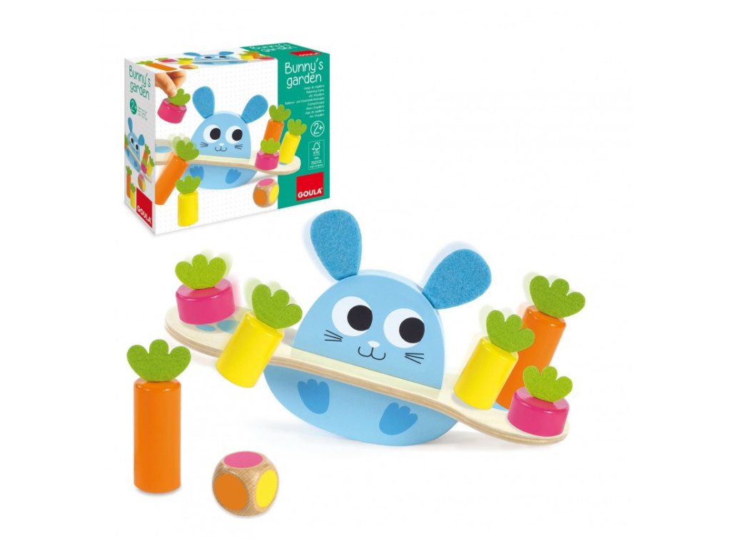 Hra obsahuje: 1 zajka na vyvažovanie, 6 kusov zeleniny, 1 hernú kocku s farbami, návod.